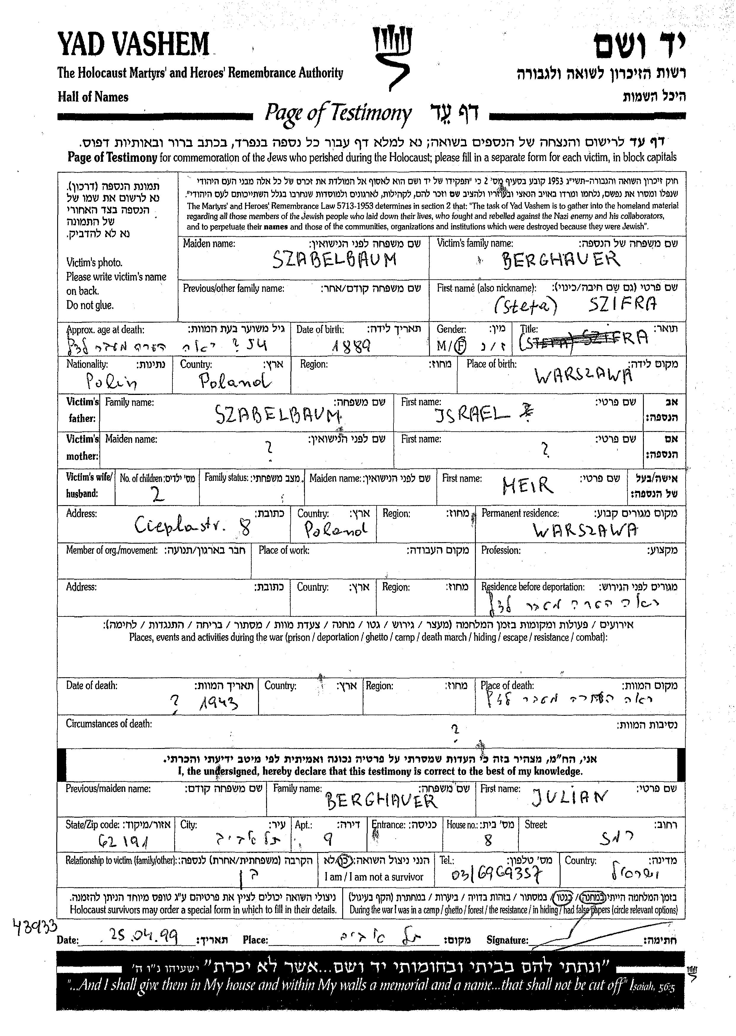 Berghauer | Szifra Stera | 1889 | Warszawa, Polen | Gedenkblatt |