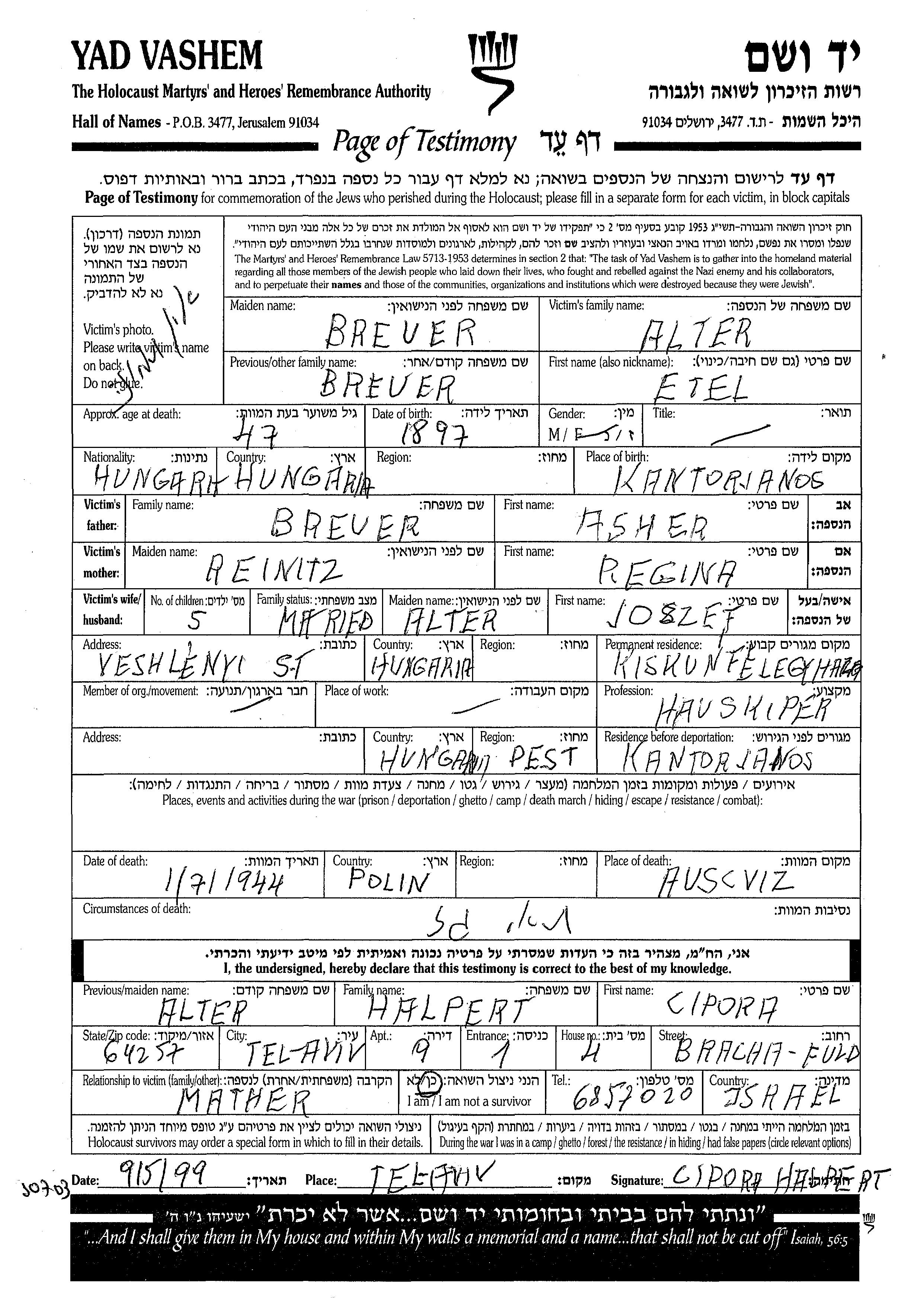 Alter Etel 1897 Kiskunfelegyhaza, Ungarn Liste von ermordeten Juden aus Ungarn