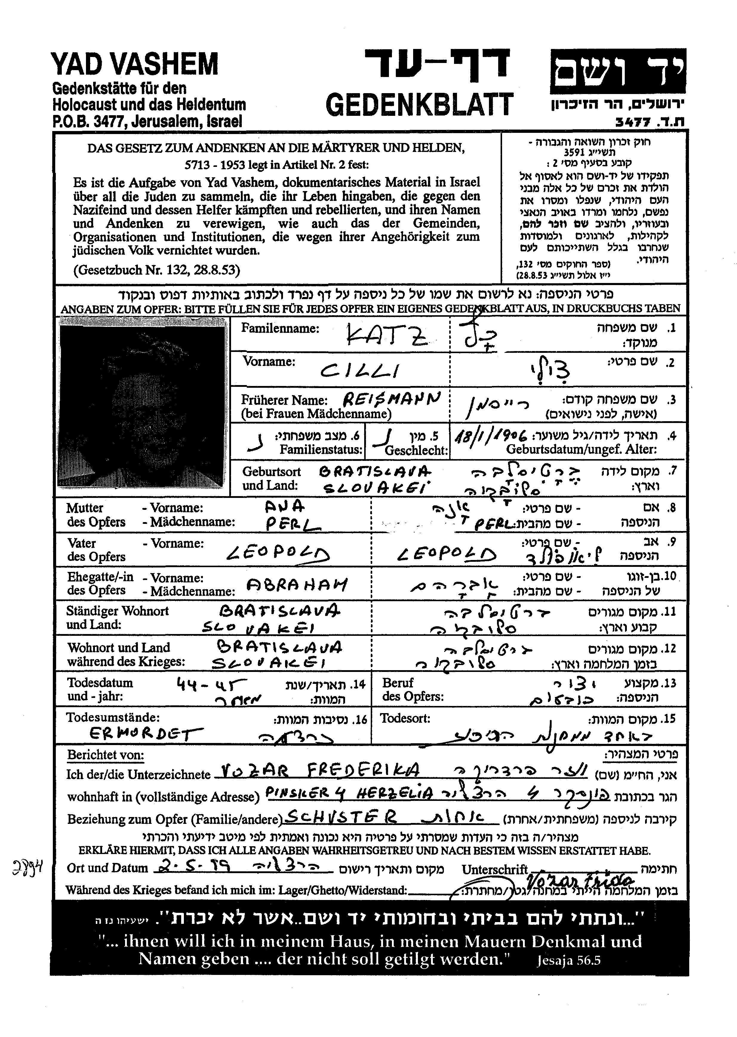 Katz Cilli 1906 Bratislava, Tschechoslowakei Gedenkblatt