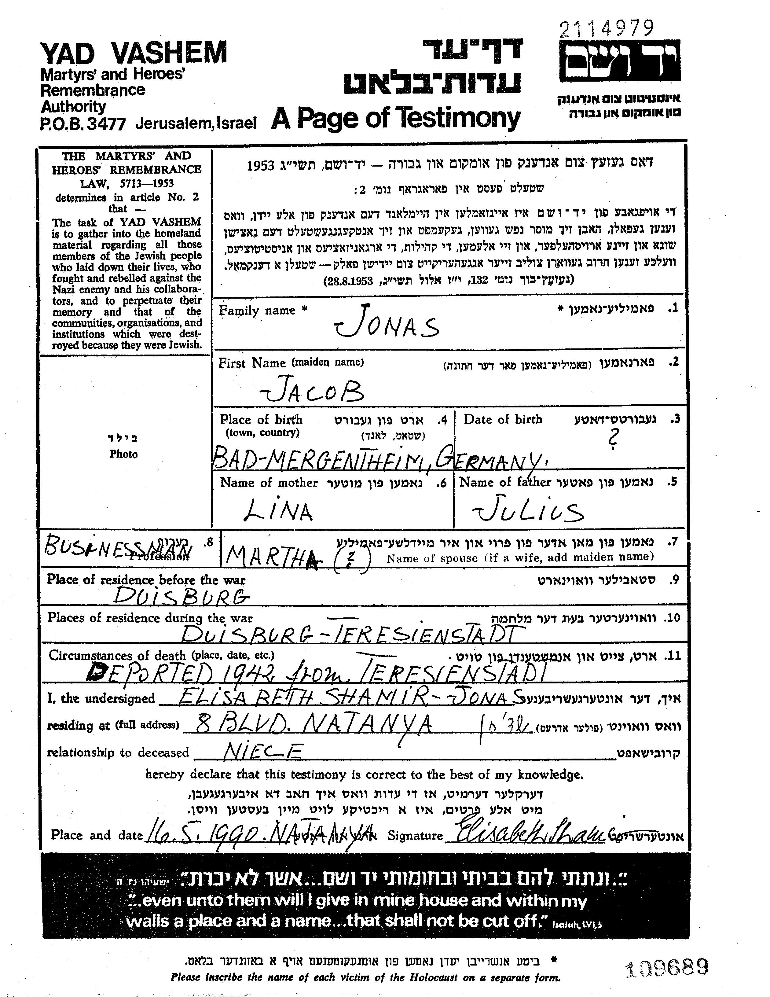 Yaakov Jonas wurde im Jahr 1895 in Bad Mergentheim, Deutsches Reich geboren. Vor dem Zweiten Weltkrieg lebte er in Duisburg, Deutsches Reich.