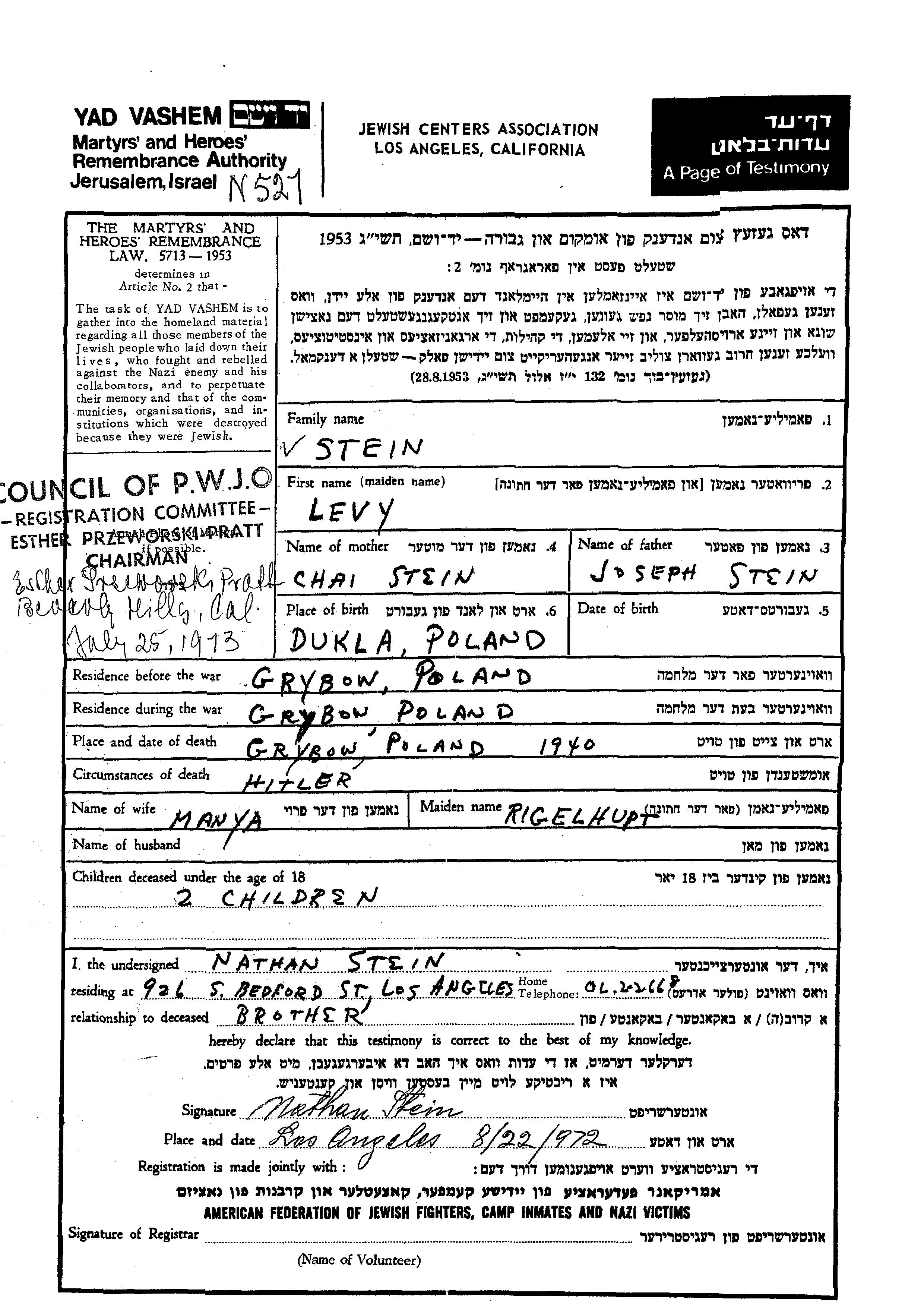 Levy Stein wurde im Jahr 1892 in Dukla, Polen geboren. Vor dem Zweiten Weltkrieg lebte er in Grybow, Polen.