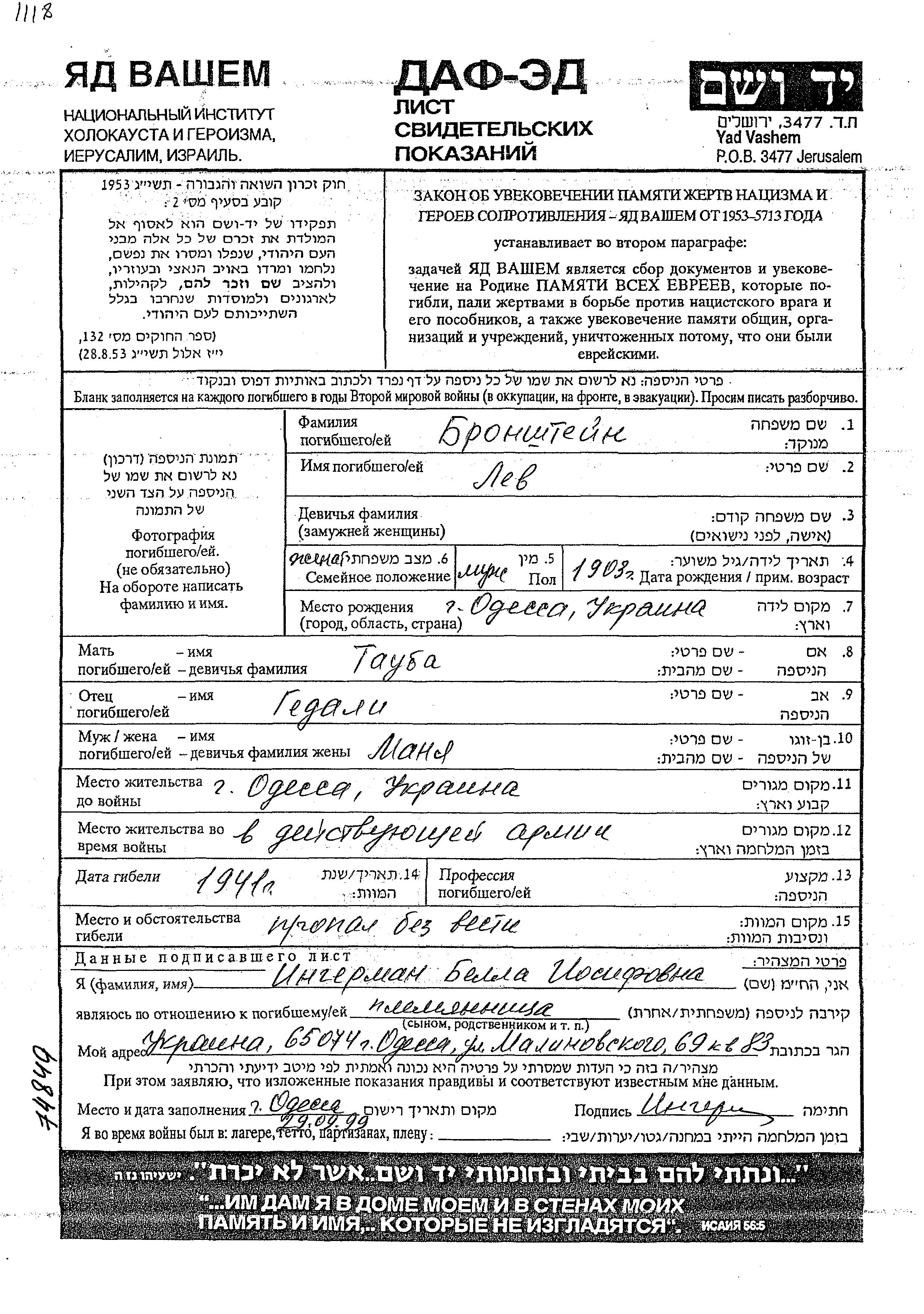 Bronshteyn Lev 1903 Odessa, Ukraine (UdSSR) Verfolgtenliste