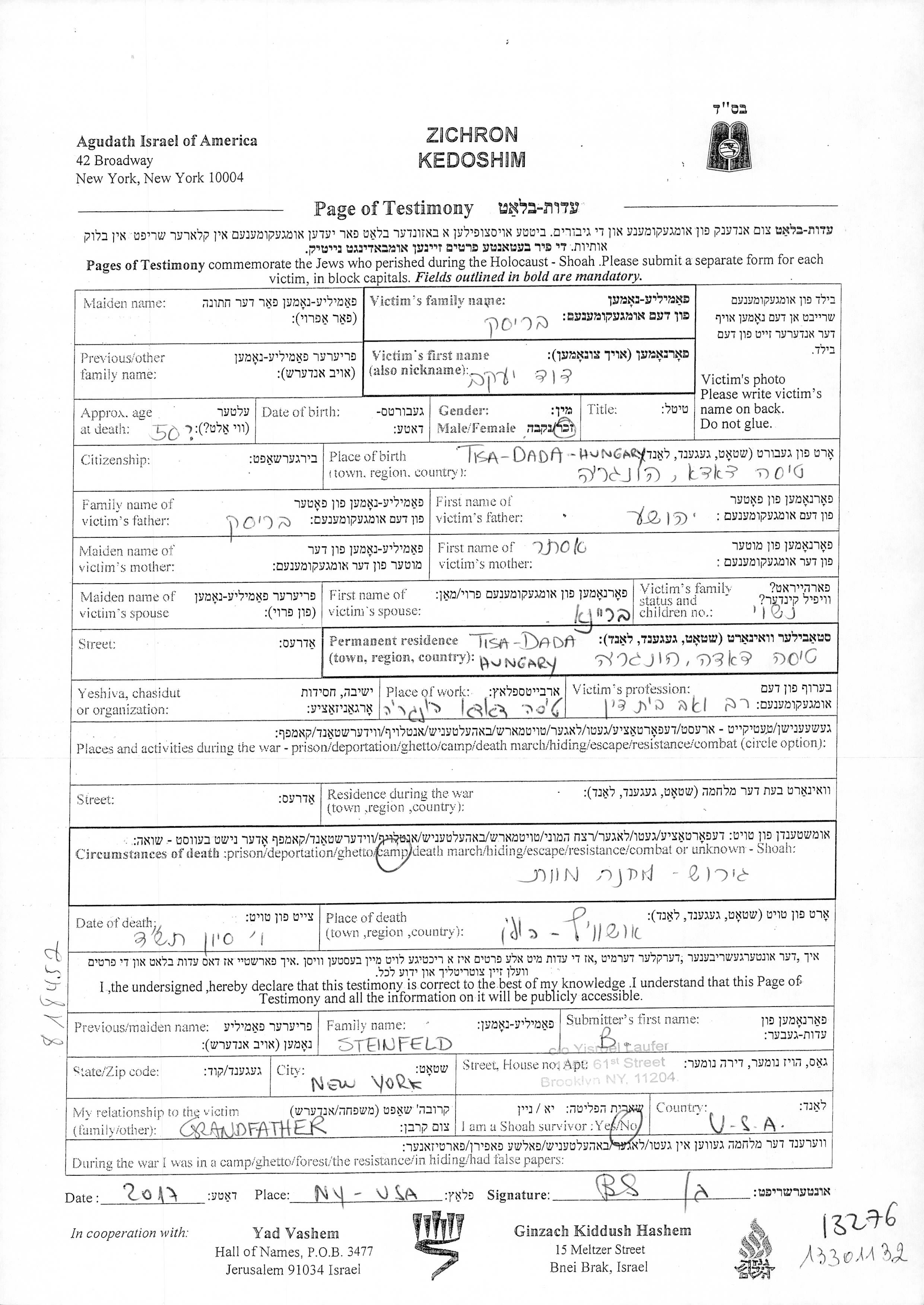 Brisk David Yaakov Tiszadada, Ungarn Gedenkblatt