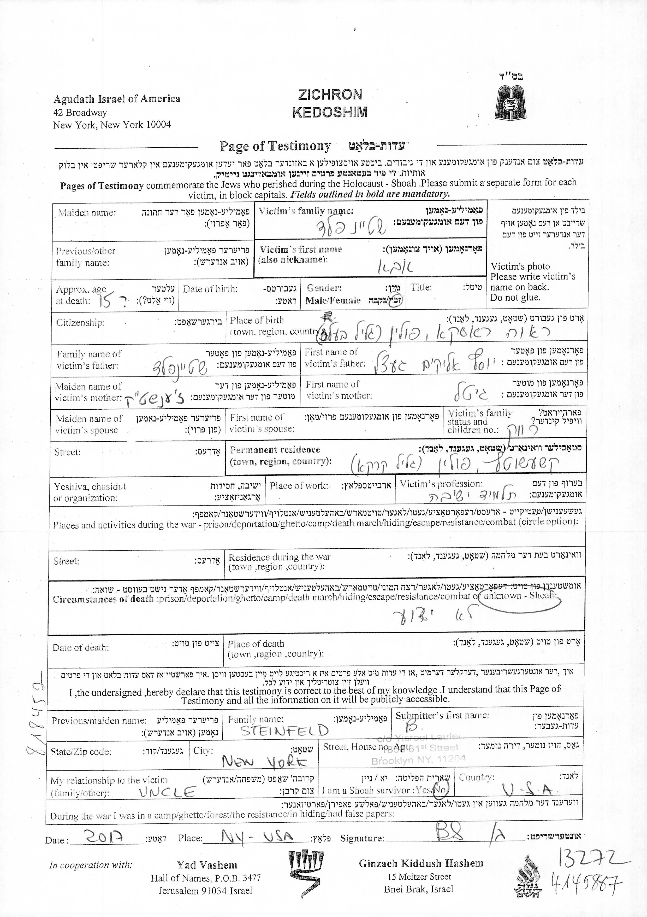 Aba Shteinfeld wurde in Rawa Ruska, Polen geboren. Er war der Sohn von Joseph Eliakim Getzl und Gitel, geb. Zienshteik. Er war Jeschiwahschüler und Kind. Vor dem Zweiten Weltkrieg lebte er in Krzeszowice, Polen.