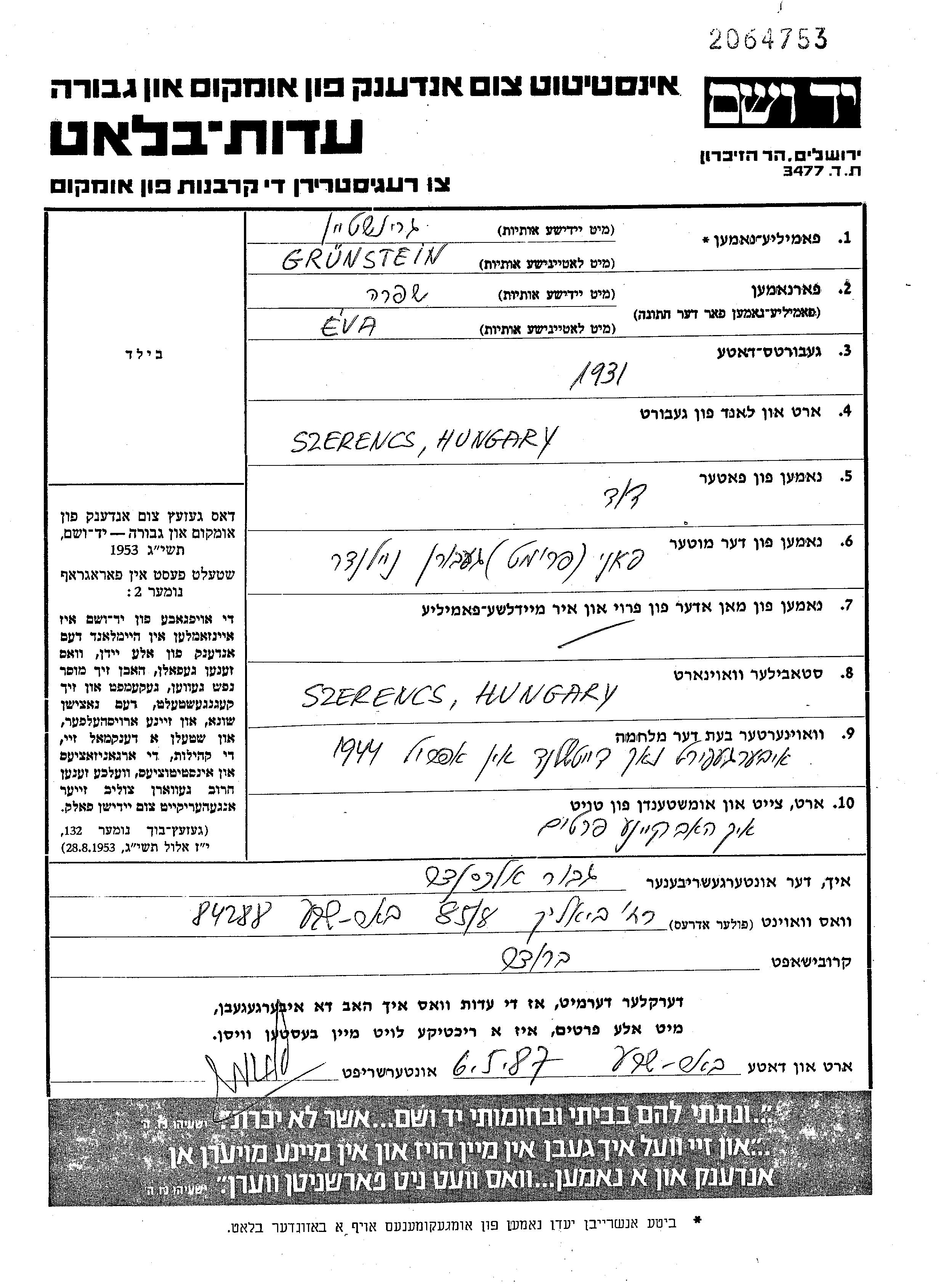 Grünstein Shifra Eva 1931 Szerencs, Ungarn Gedenkblatt