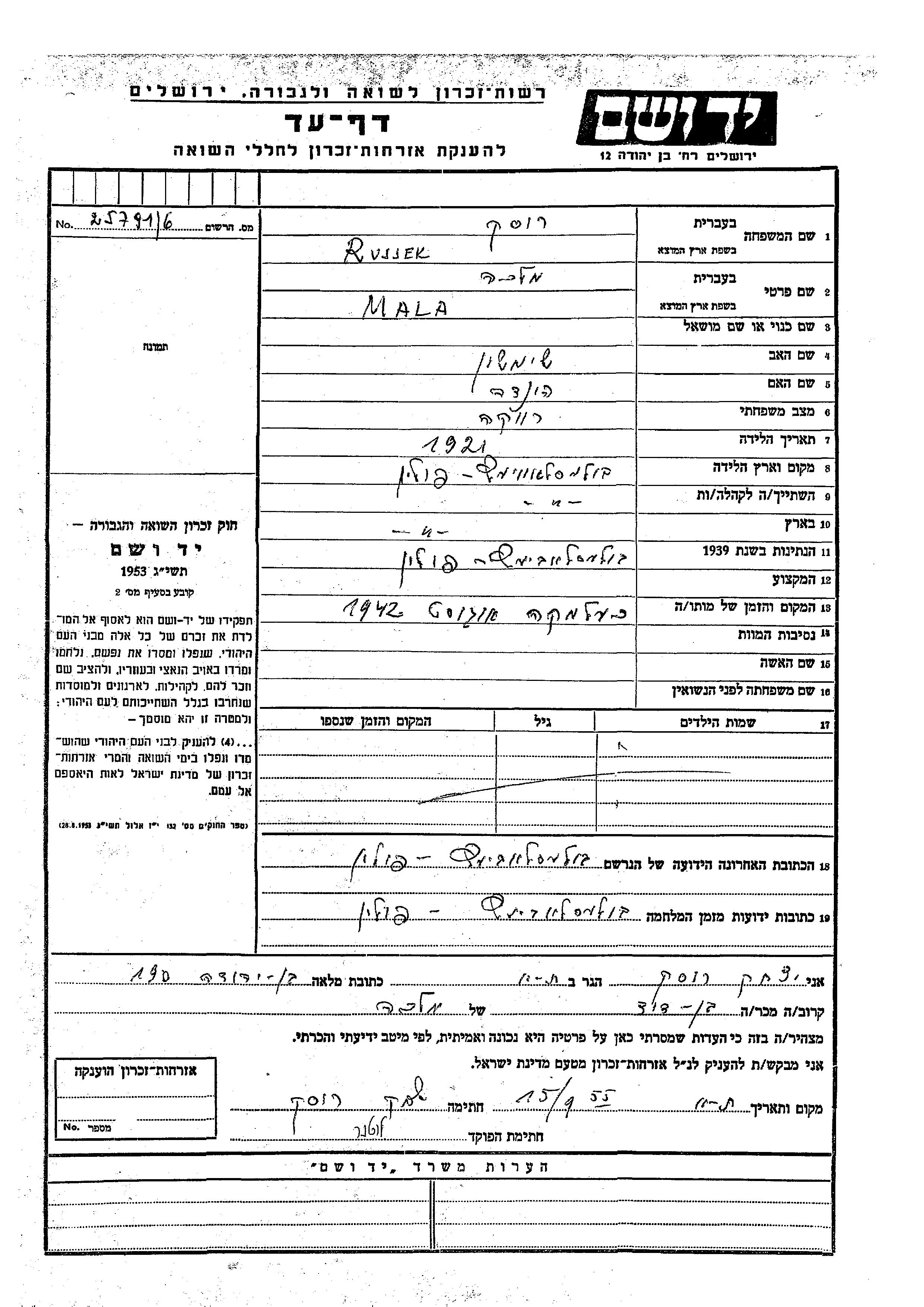 Malka Russek wurde im Jahr 1921 in Boleslawiec, Polen geboren. Sie war Schüler/-in. Vor dem Zweiten Weltkrieg lebte sie in Boleslawiec, Polen.