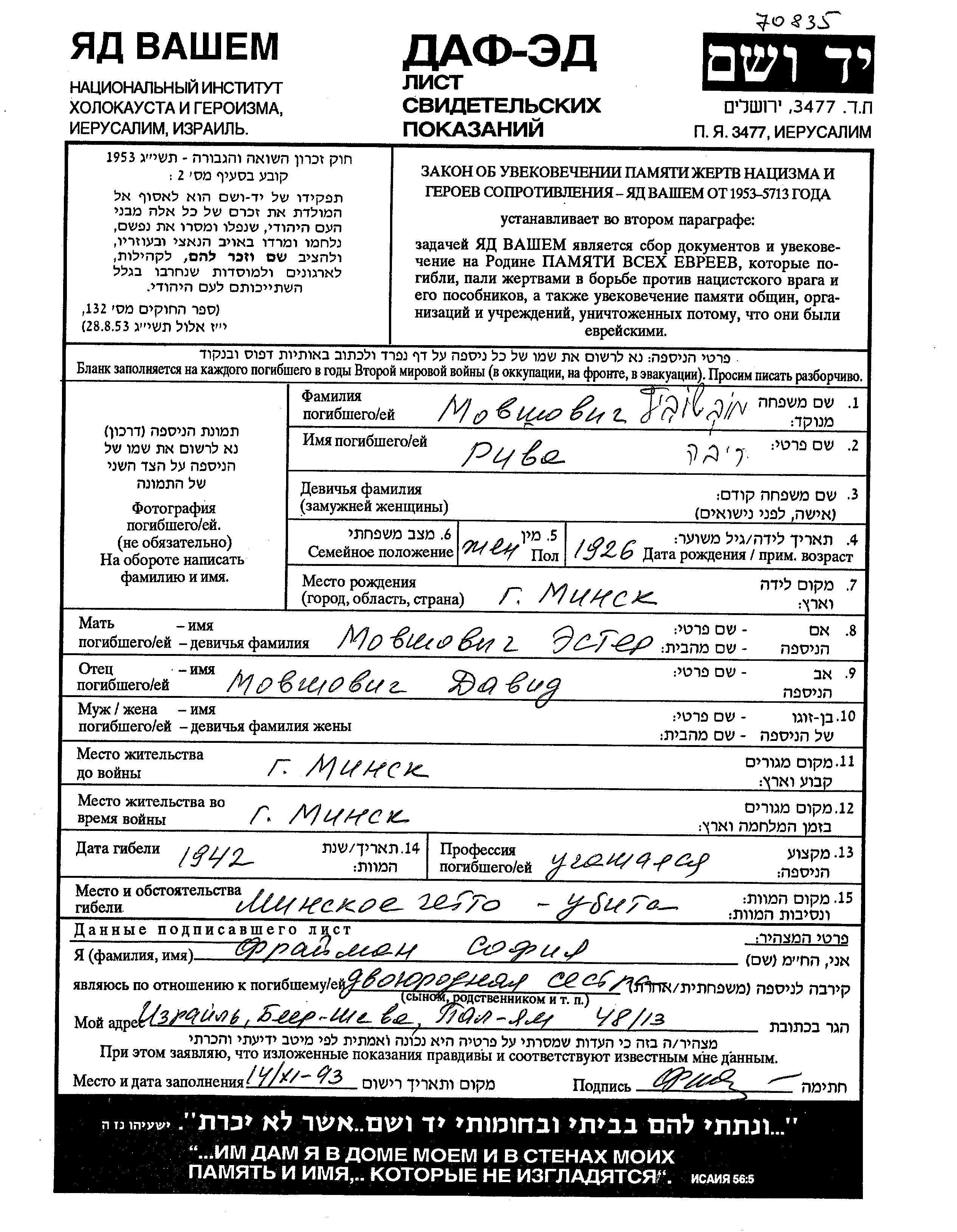 Riva Movshovich wurde im Jahr 1926 in Minsk, Weißrussland (UdSSR) geboren. Vor dem Zweiten Weltkrieg lebte sie in Minsk, Weißrussland (UdSSR).