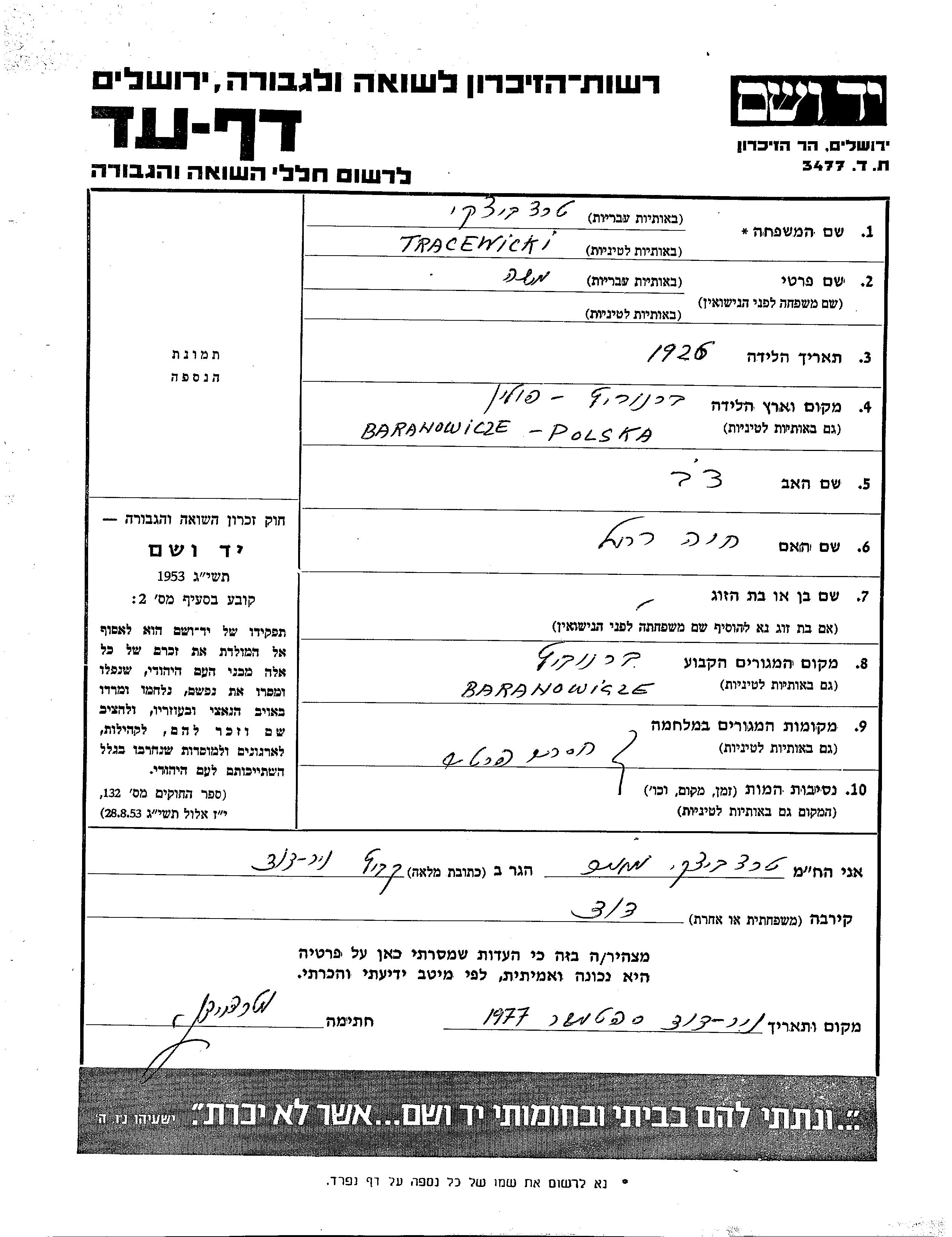 Moshe Tracewicki wurde im Jahr 1926 in Baranowicz, Polen geboren. Vor dem Zweiten Weltkrieg lebte er in Baranowicz, Polen.