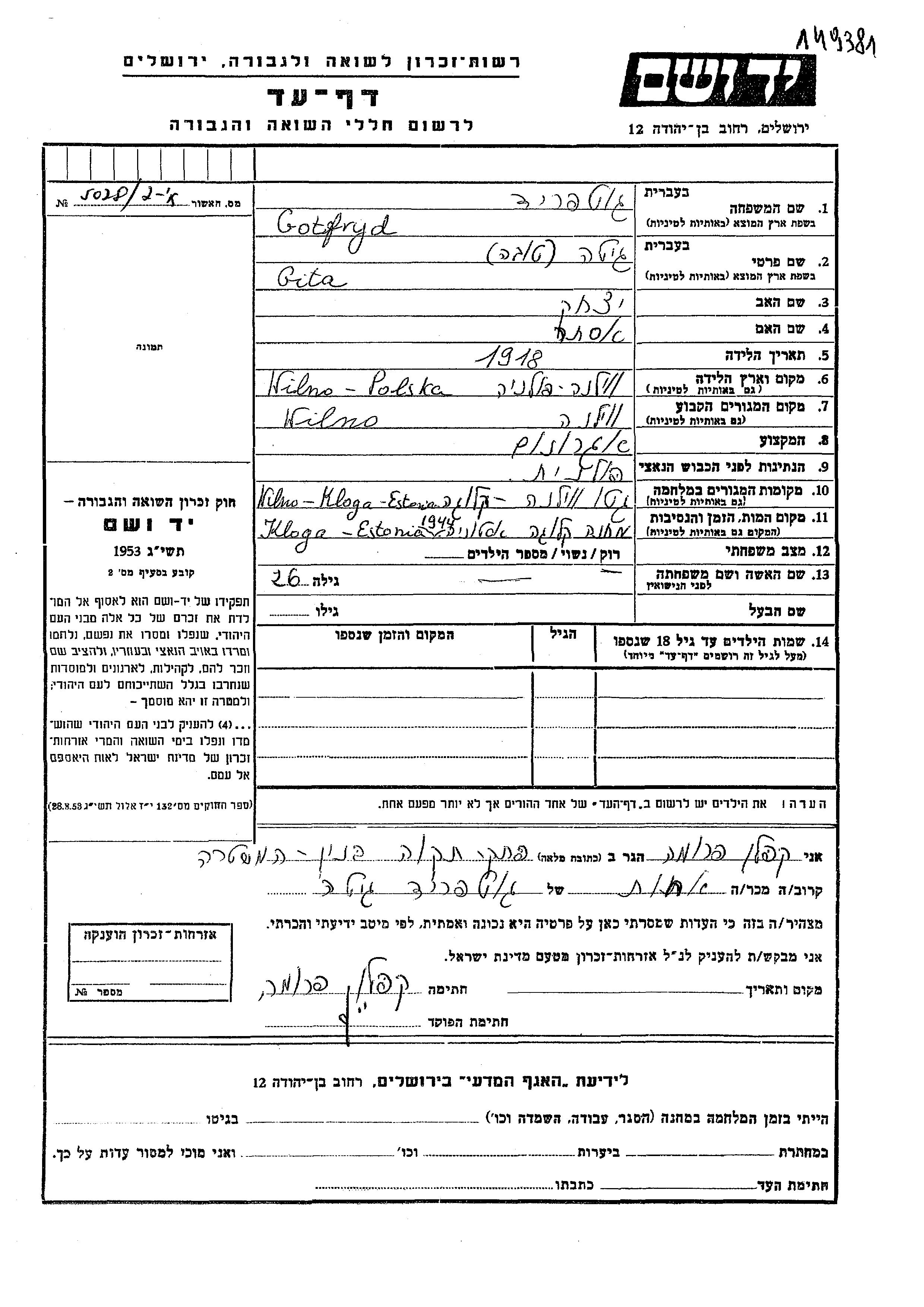 Gita Tova Gotfryd wurde im Jahr 1918 in Wilno, Polen geboren. Vor dem Zweiten Weltkrieg lebte sie in Wilno, Polen.