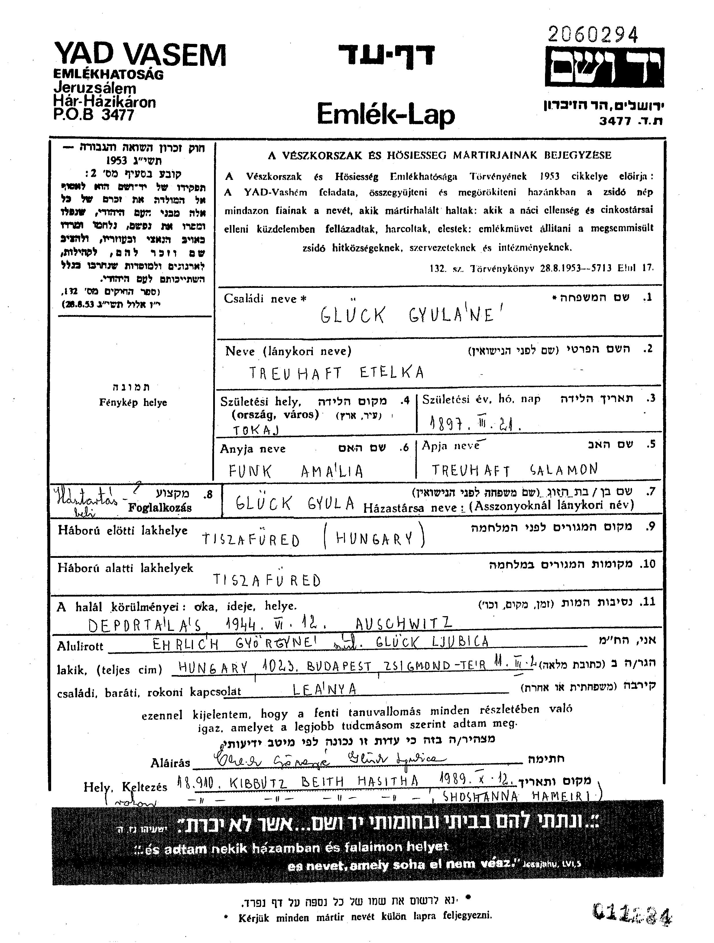Gluck Etel 1897 Tiszafured, Ungarn Liste von ermordeten Personen