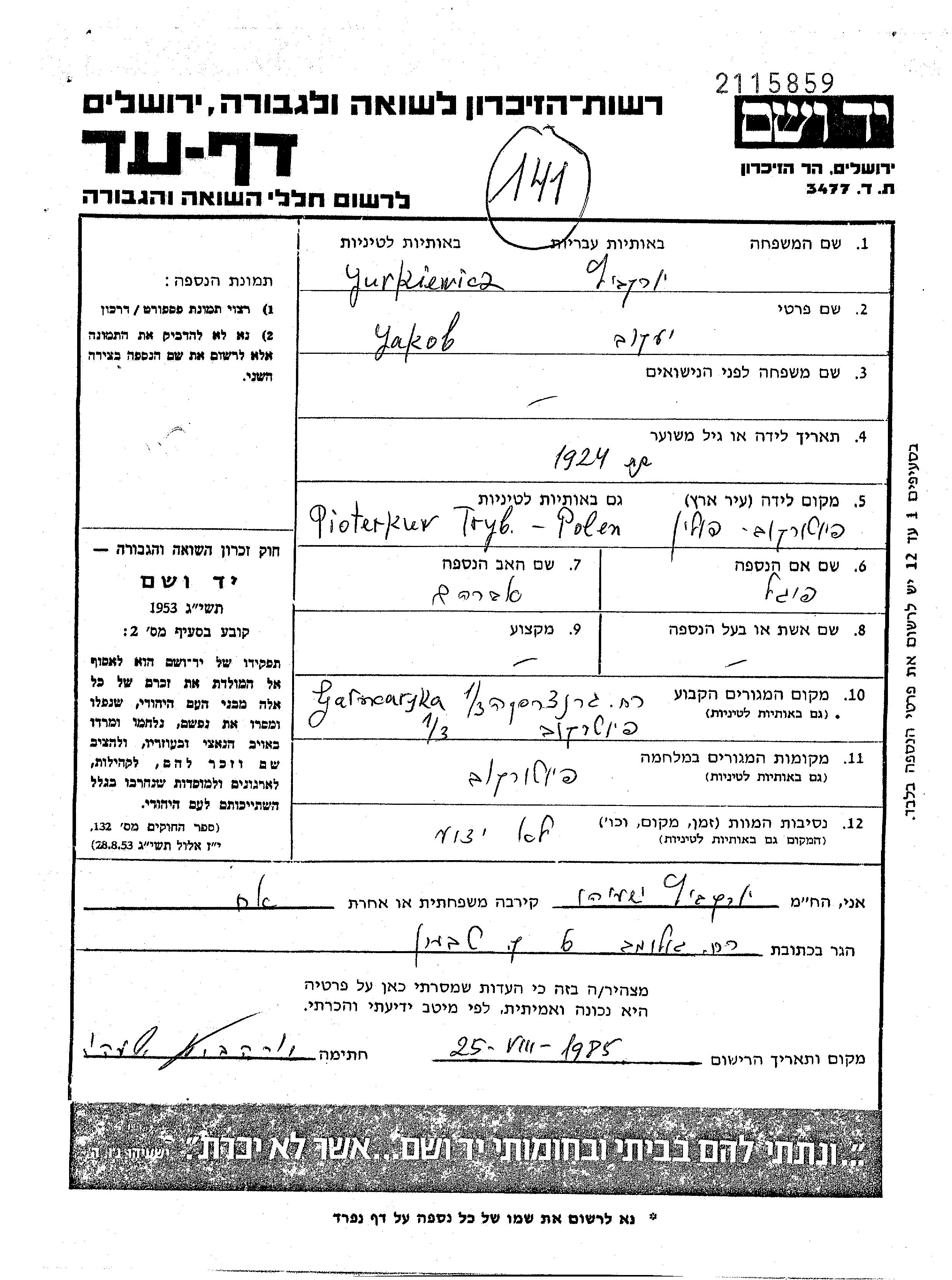 Yaakov Jurkiewicz wurde im Jahr 1924 in Piotrkow Trybunalski, Polen geboren. Vor dem Zweiten Weltkrieg lebte er in Piotrkow Trybunalski, Polen.