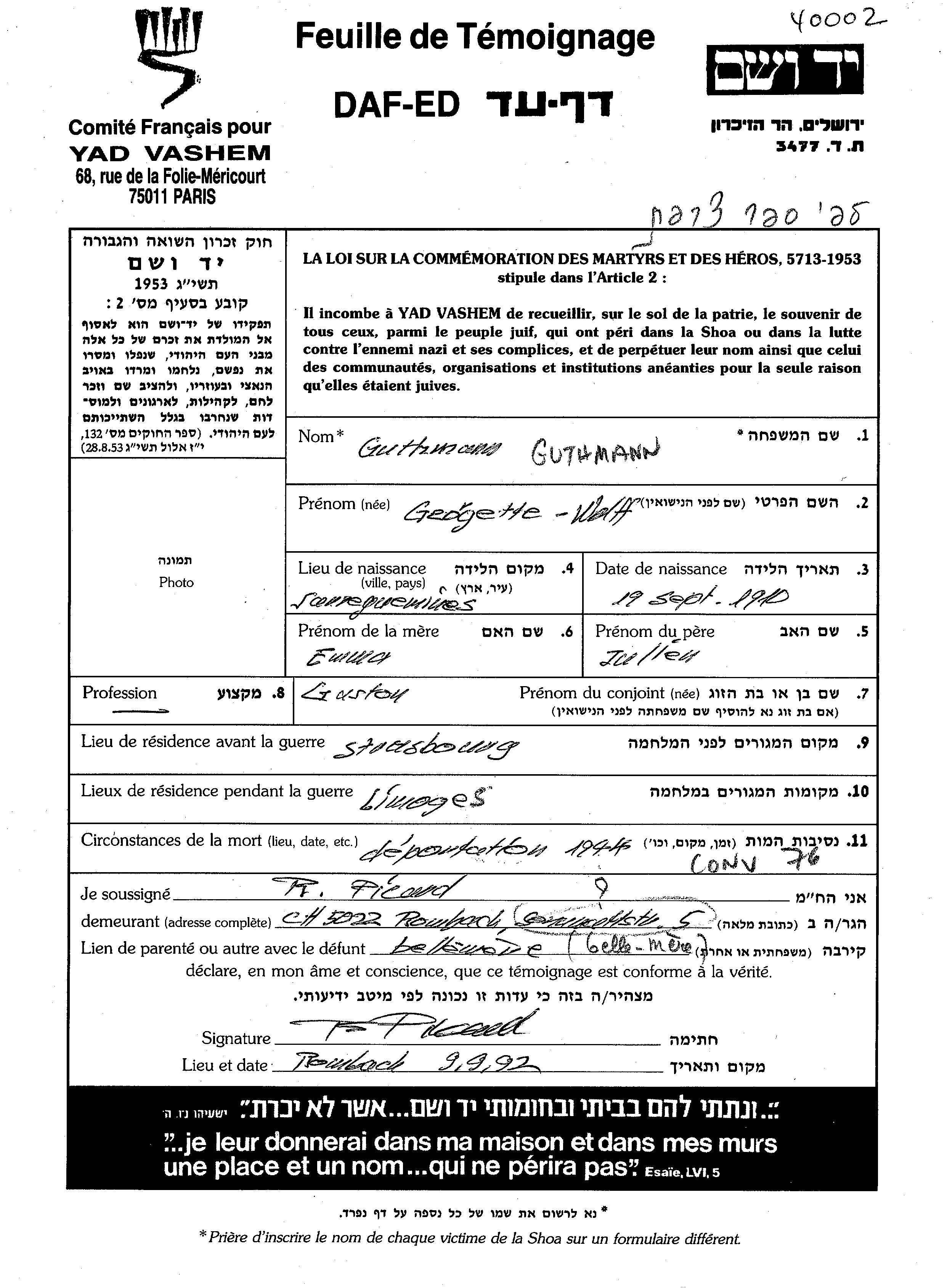Georgette Guthmann, geb. Wolff wurde im Jahr 1910 in Sarreguemines, Frankreich geboren. Vor dem Zweiten Weltkrieg lebte sie in Strasbourg, Frankreich.