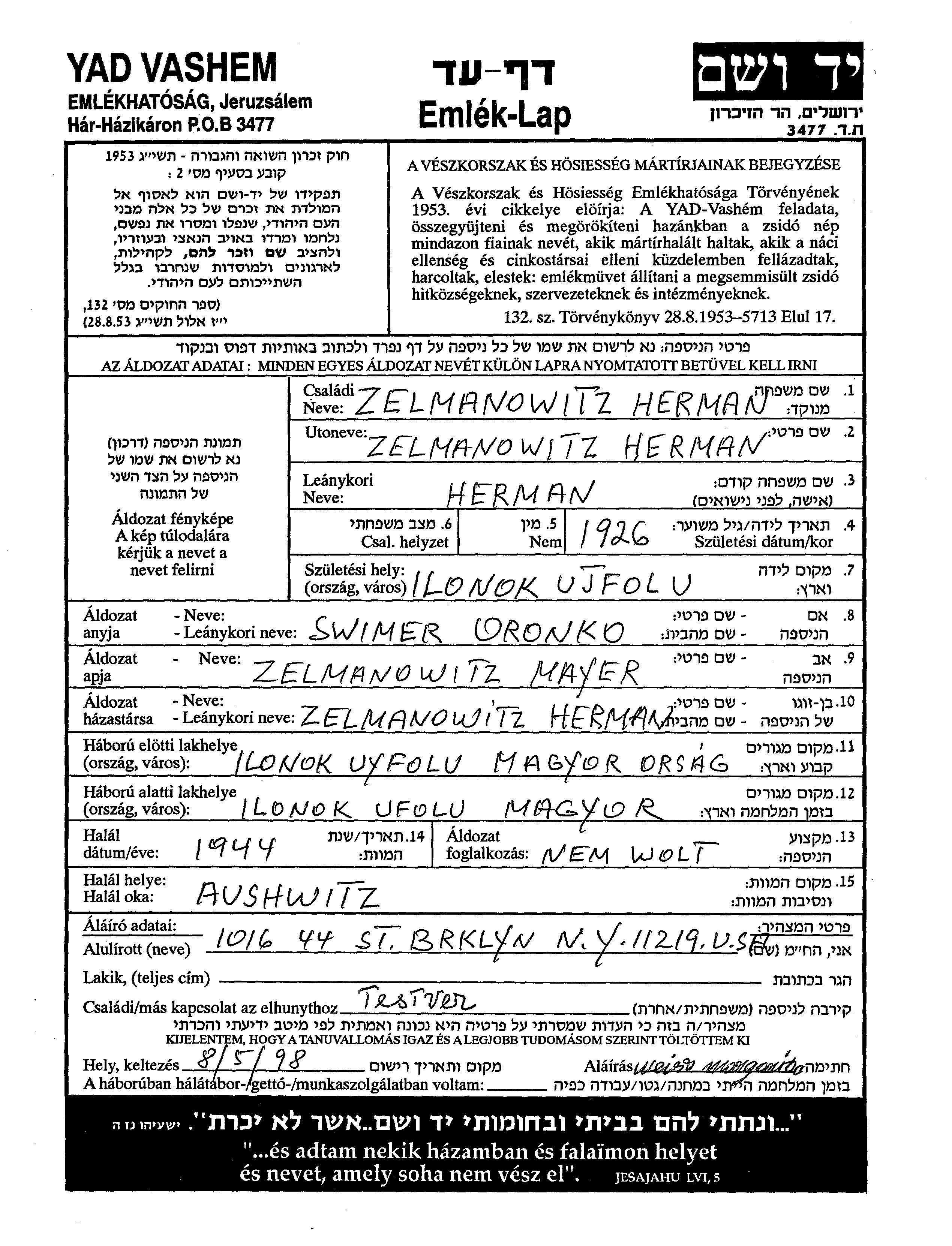 Zelmanowitz Herman 1926 Ilonok-Ujfalu, Tschechoslowakei Gedenkblatt