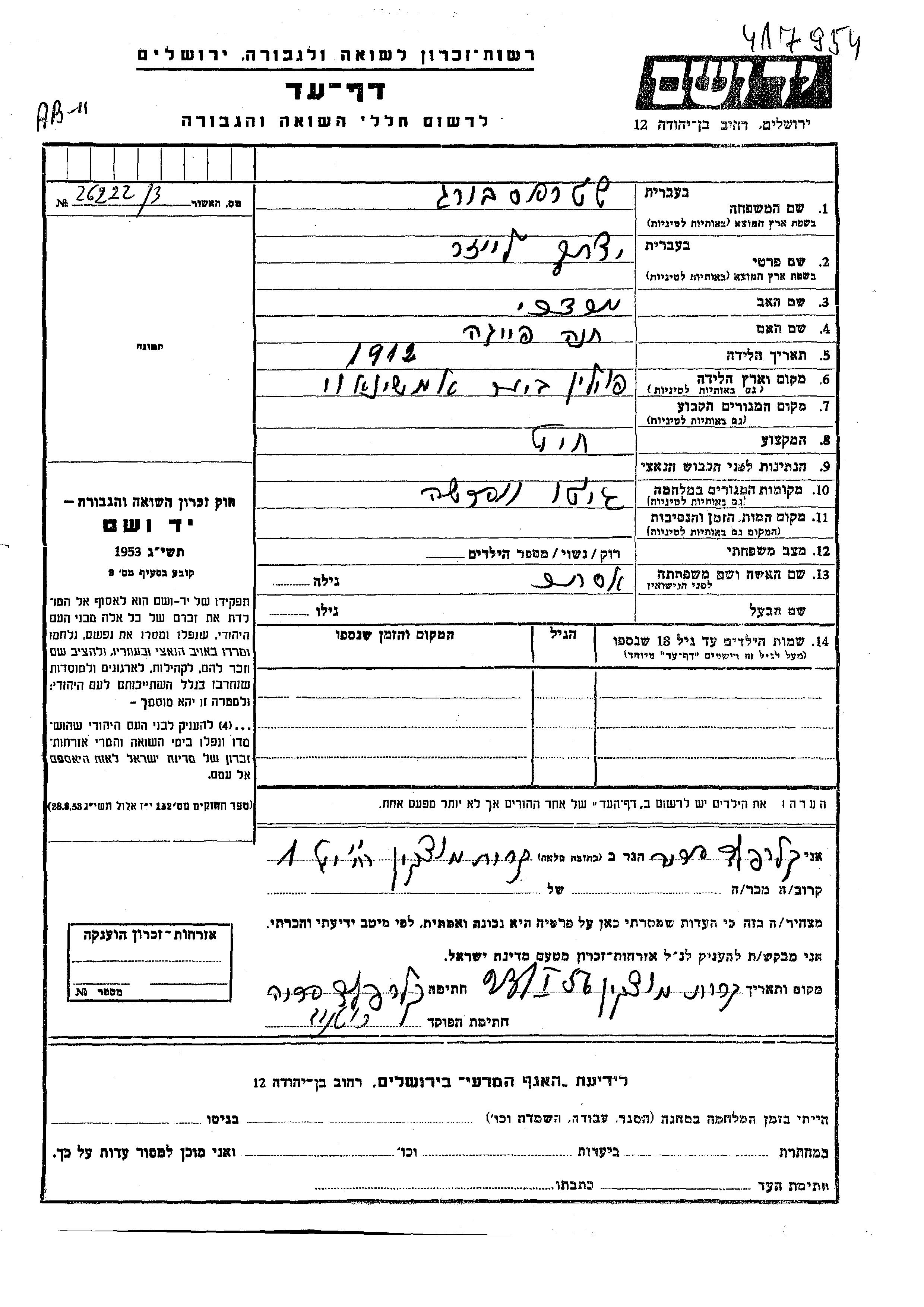 Shtrasburg Yitzkhak Leizer 1912 unbekannter Ort, Gedenkblatt