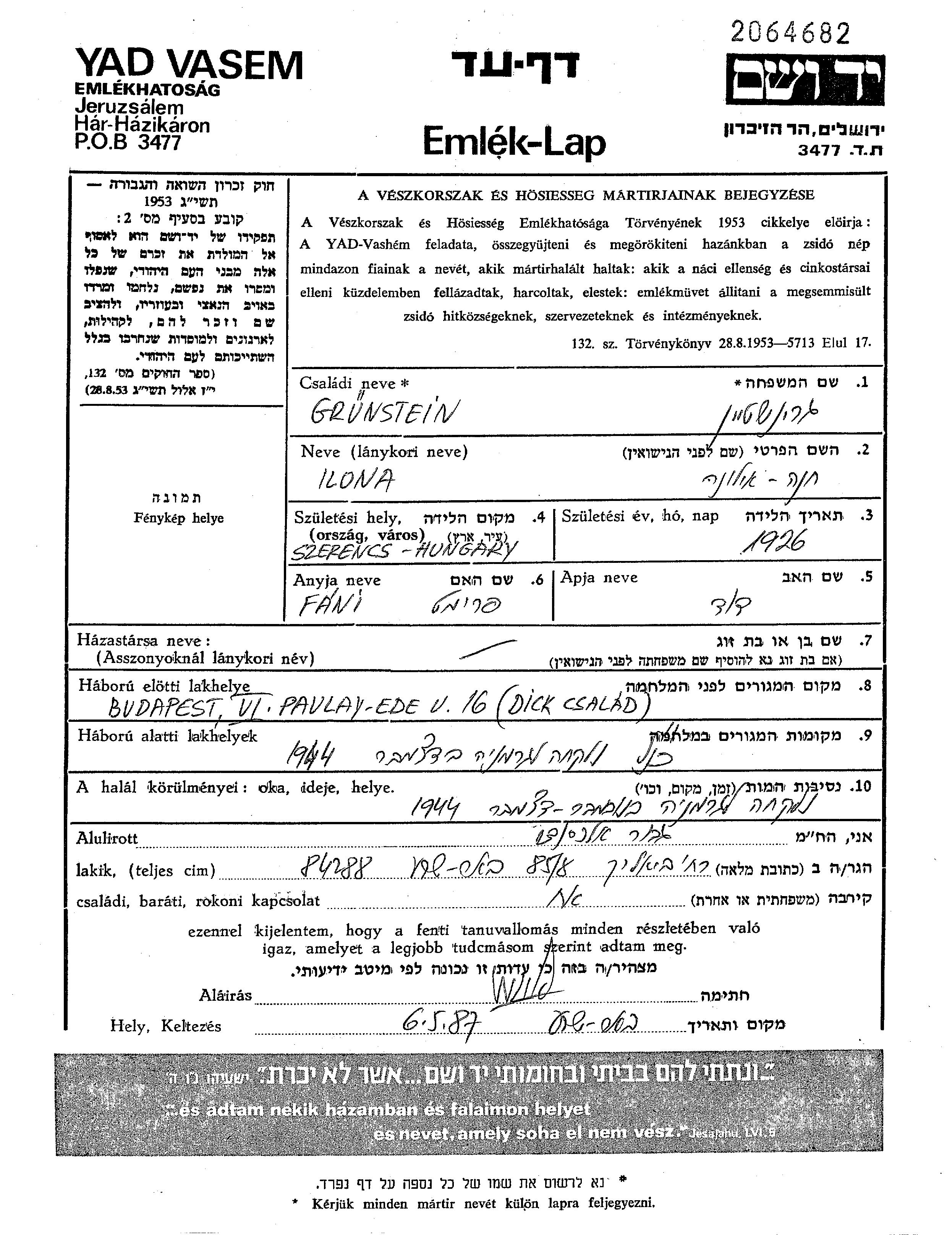 | Grünstein | Khana Ilona | 1926 | Budapest, Ungarn | Gedenkblatt |