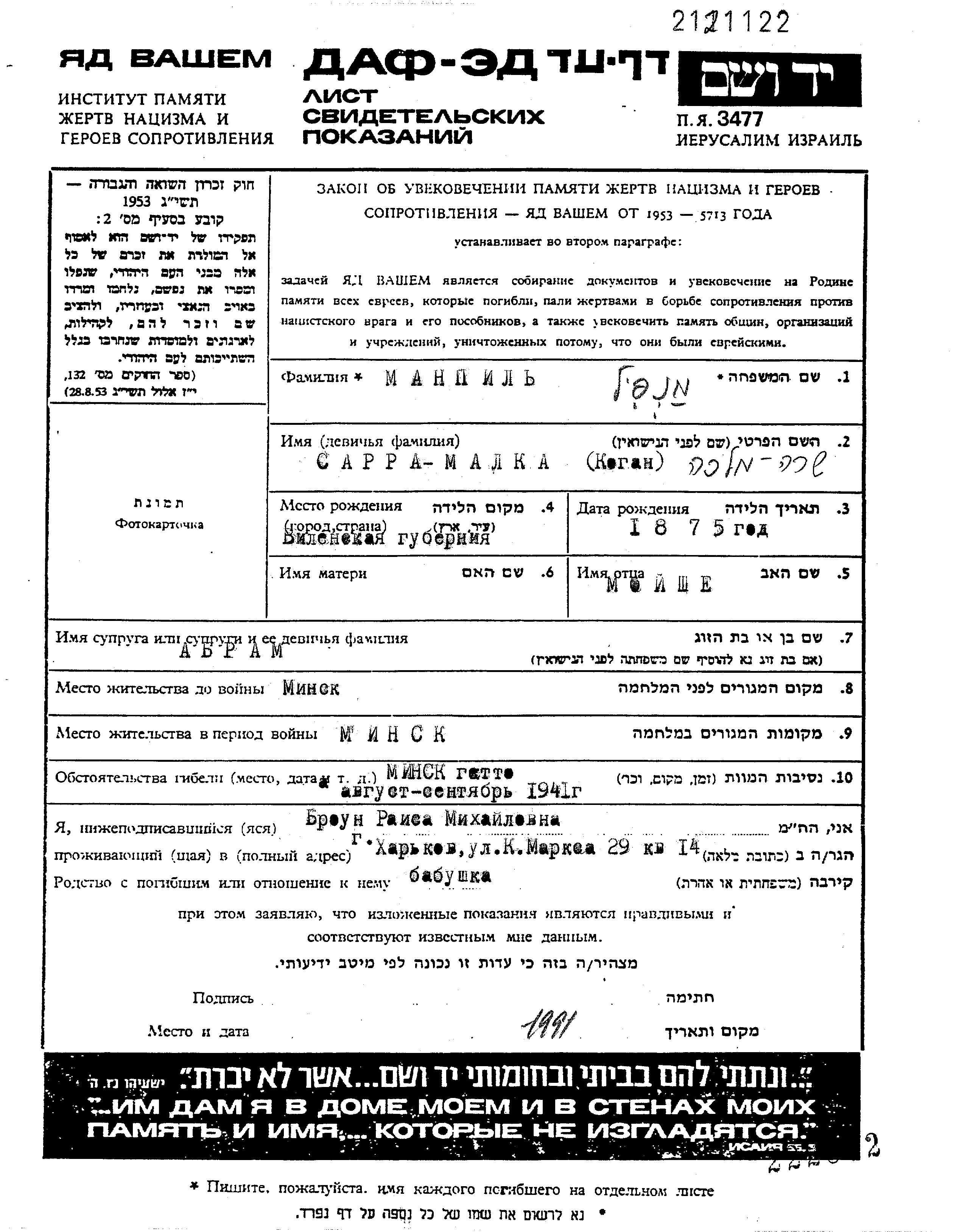 Sara Malka Manpil, geb. Kogan wurde im Jahr 1875 in Wilno, Polen geboren. Sie war Hausfrau. Vor dem Zweiten Weltkrieg lebte sie in Minsk, Weißrussland (UdSSR).