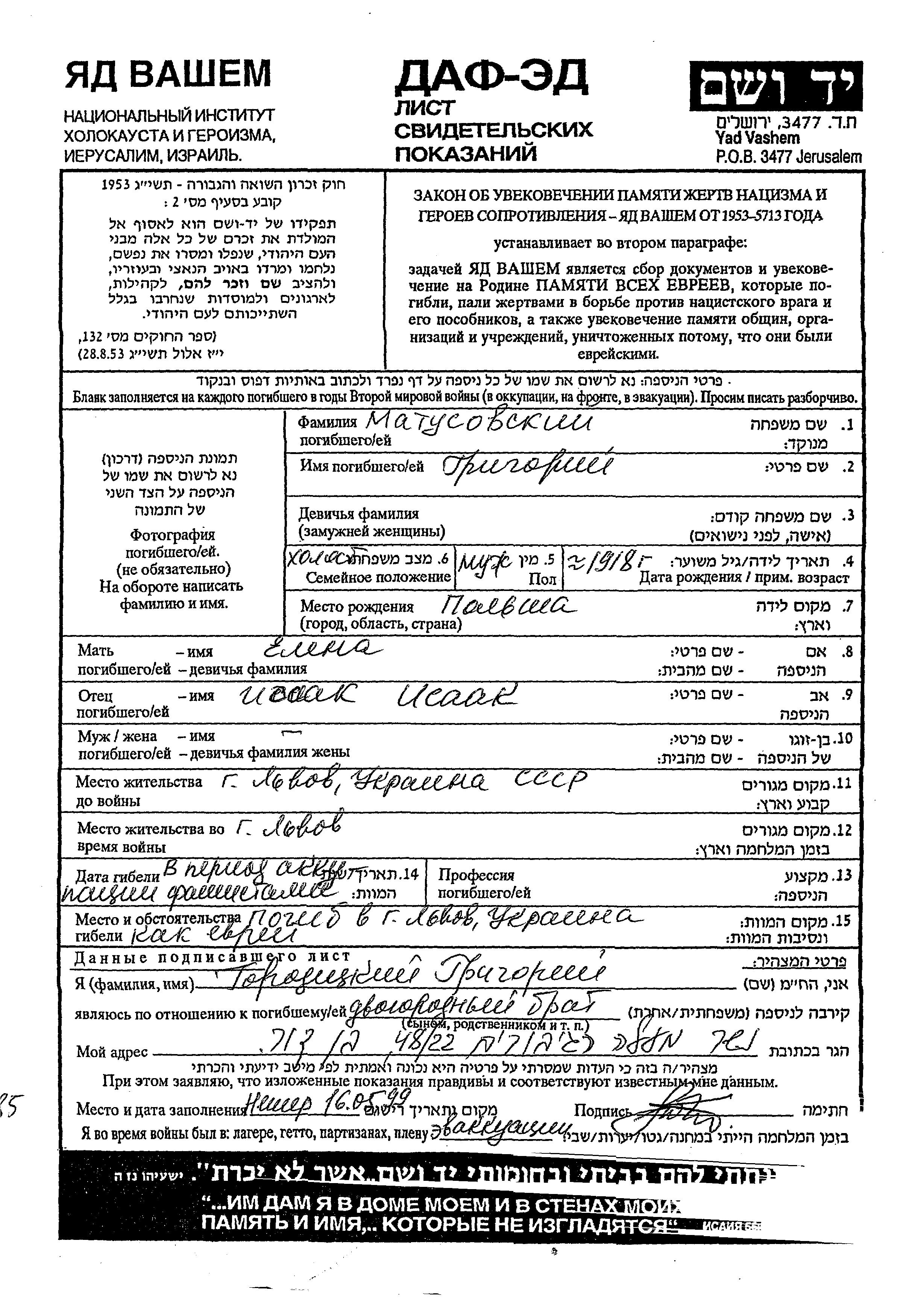 Matusovski Grigori 1918 Lwow, Polen Gedenkblatt