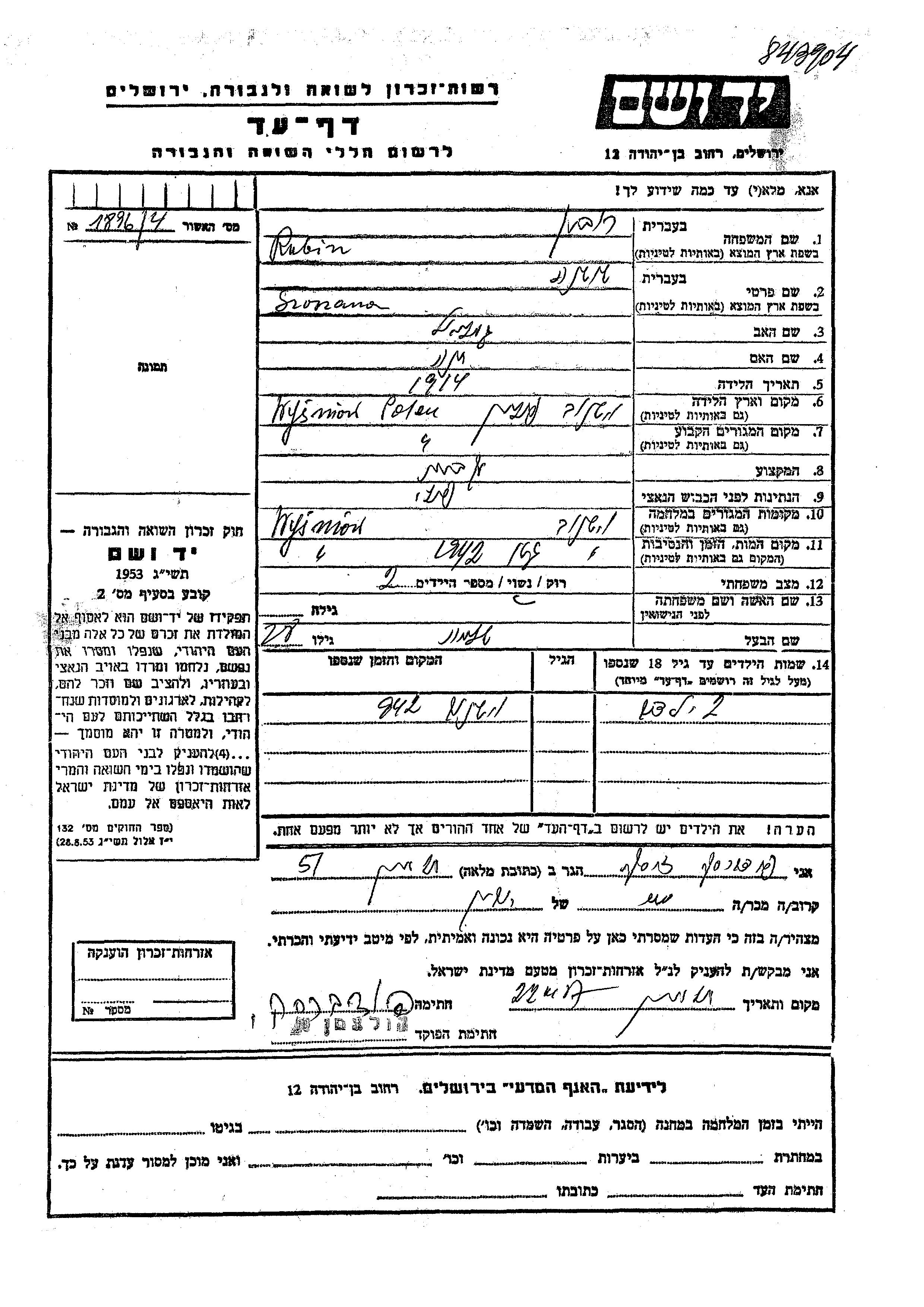 Szoszana Rubin wurde im Jahr 1914 in Wiszniew, Polen geboren. Sie war die Tochter von Gamliel und Khana. Sie war Hausfrau und mit Shlomo Verheiratet. Vor dem Zweiten Weltkrieg lebte sie in Wiszniew, Polen. Während des Krieges war sie in Wiszniew, Polen.