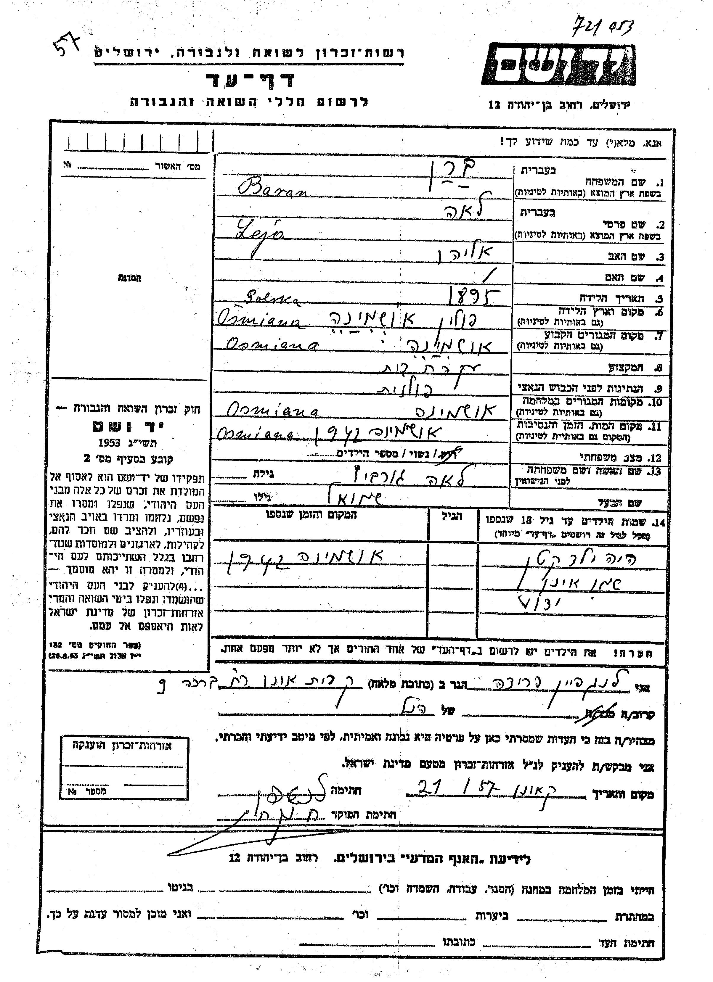 Lea Baran, geb. Gurvich wurde im Jahr 1895 geboren. Vor dem Zweiten Weltkrieg lebte sie in Oszmiana, Polen.