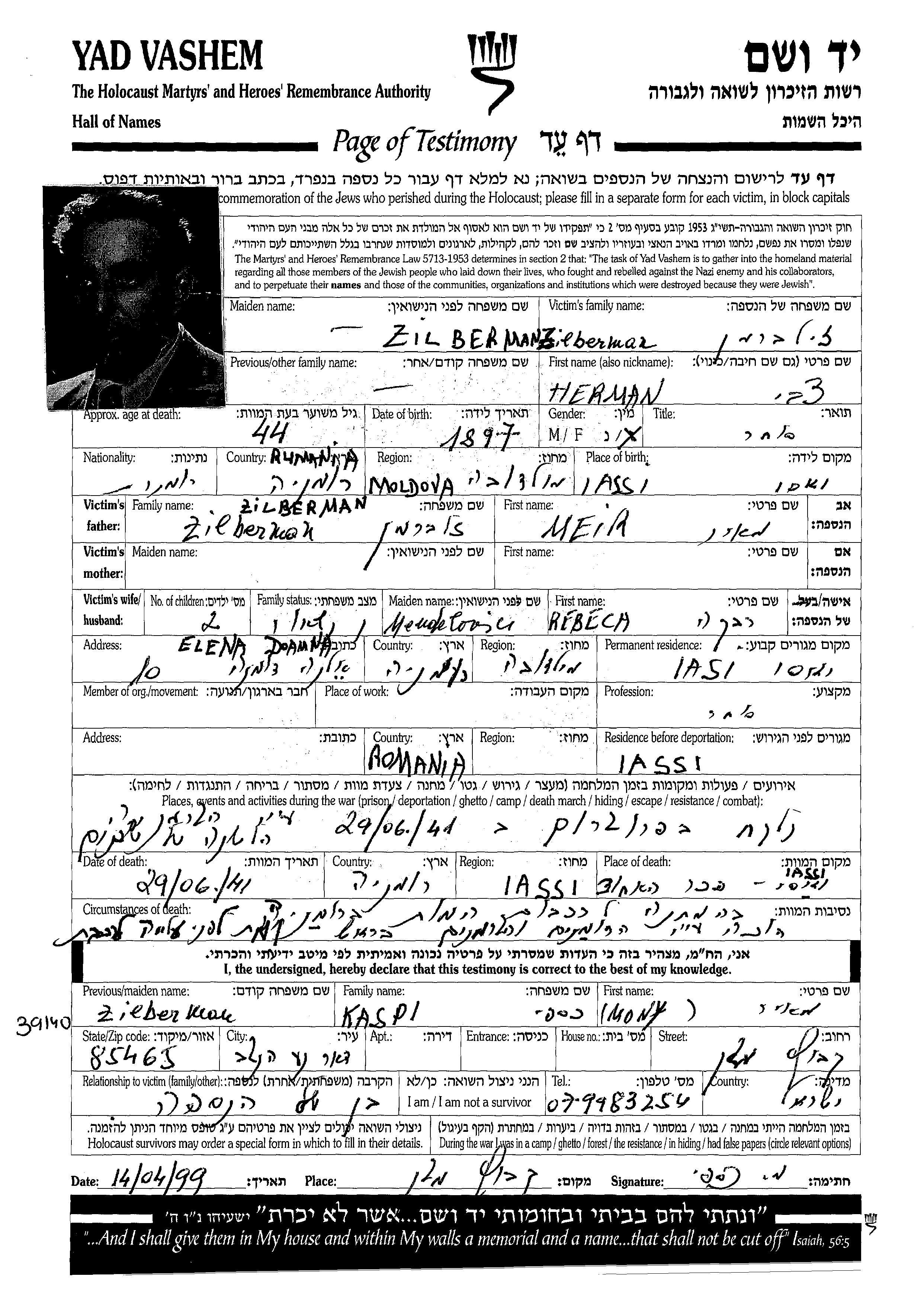 Zilberman Herman Tzvi 1897 Iasi, Rumänien Gedenkblatt