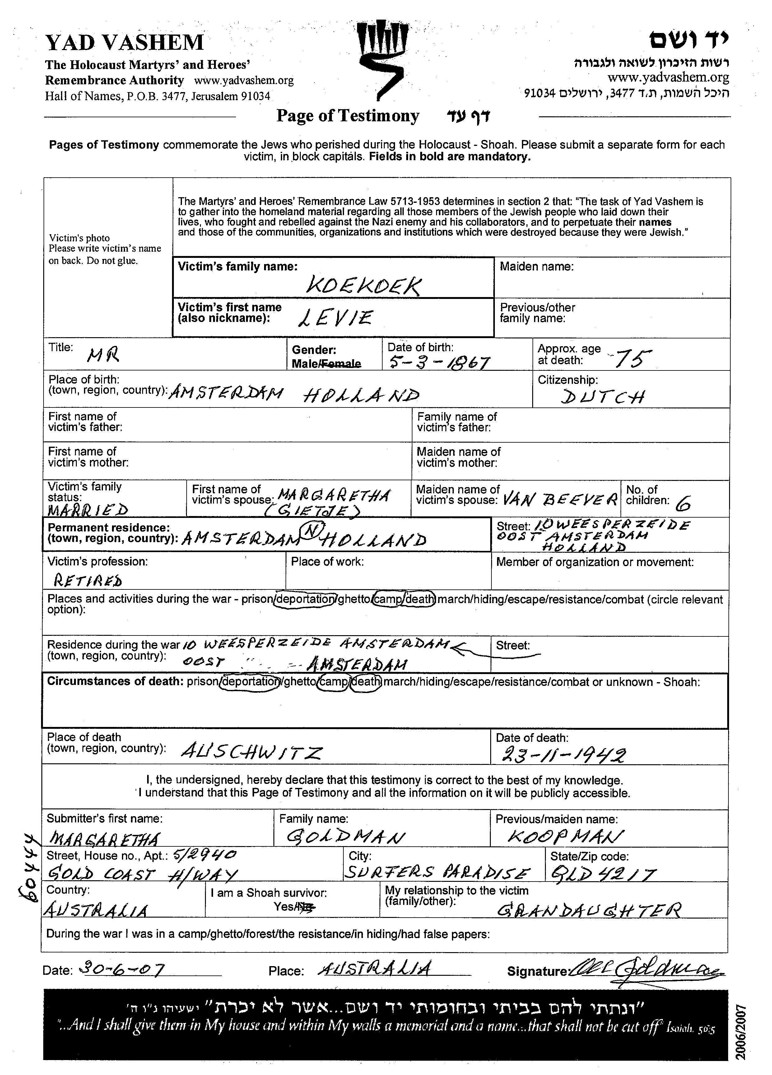 Levie wurde in der Schoah ermordet. Todesort: Auschwitz, Polen im Jahr 23/11/1942.