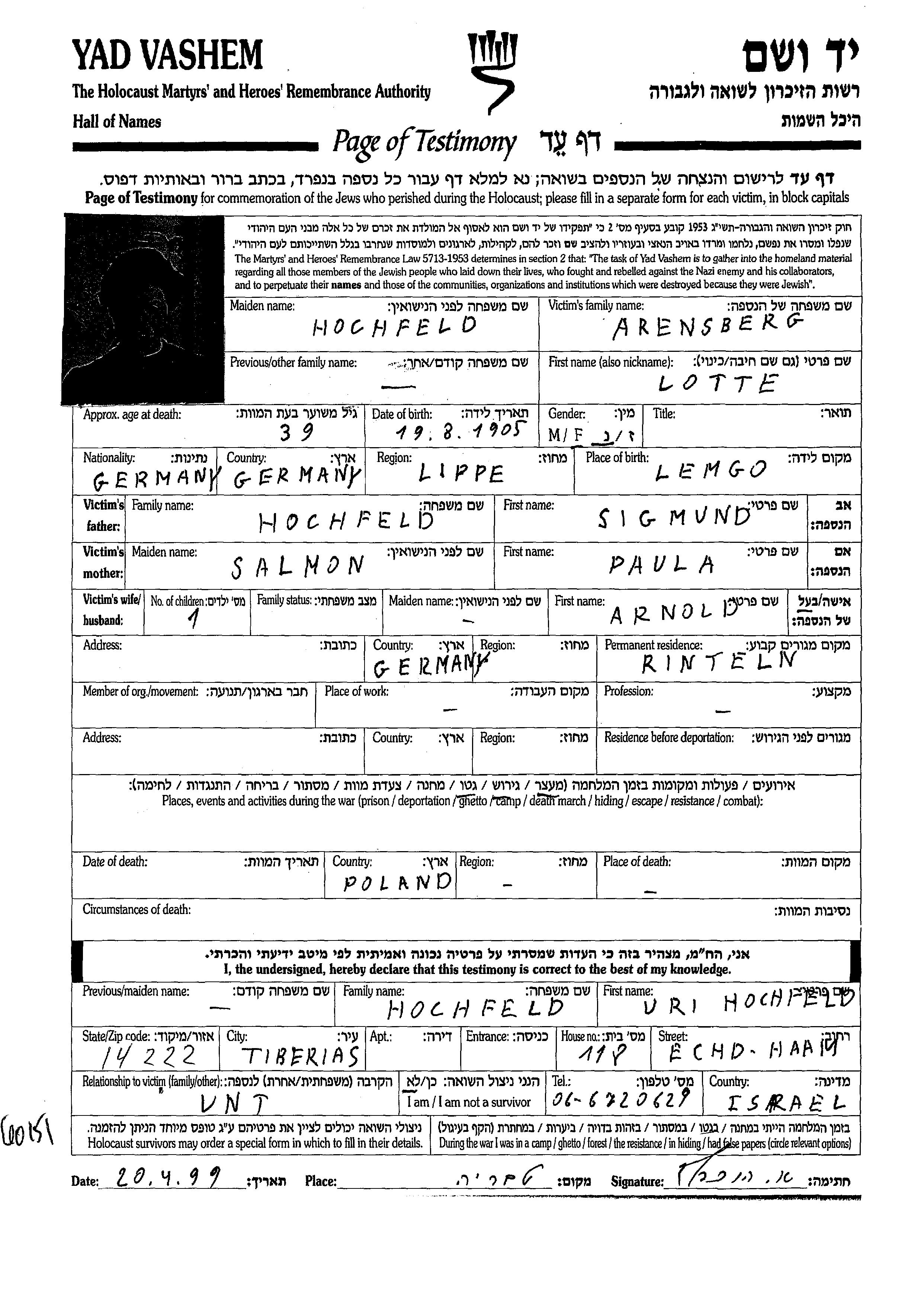Arensberg | Charlotte Lotte Gertrud | 1905 | Rinteln, Deutsches Reich | Liste von ermordeten Juden aus Deutschland |