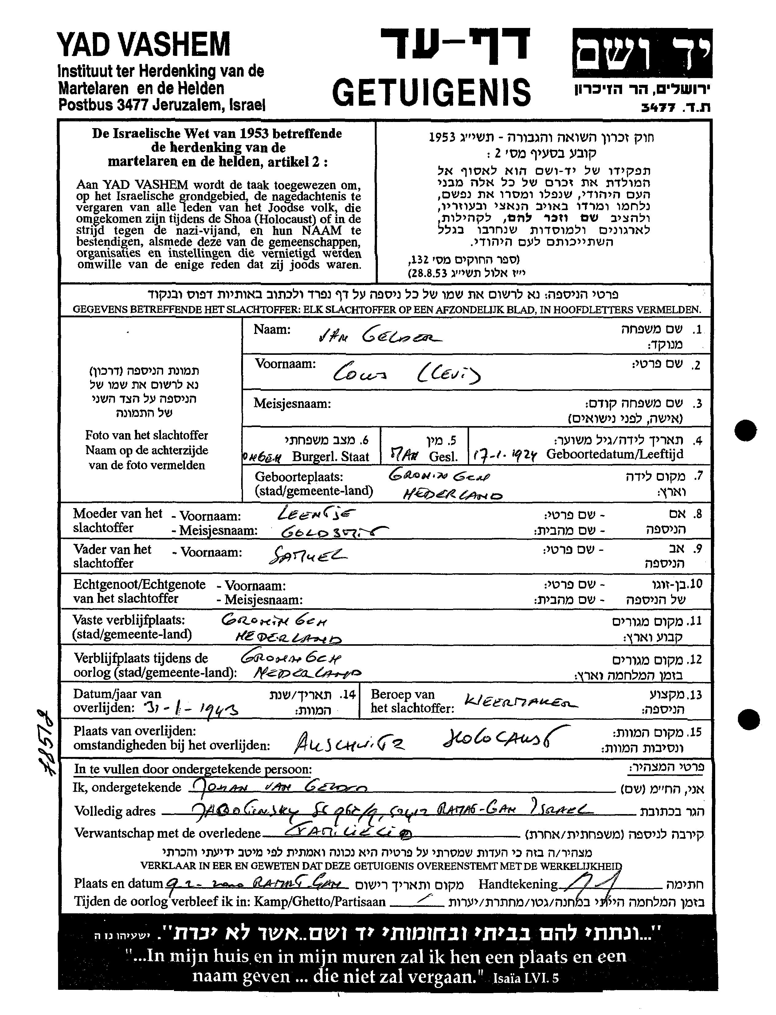 Louis Levi Gelder van wurde im Jahr 1924 in Groningen, Niederlande geboren. Er war Schneider. Vor dem Zweiten Weltkrieg lebte er in Groningen, Niederlande.