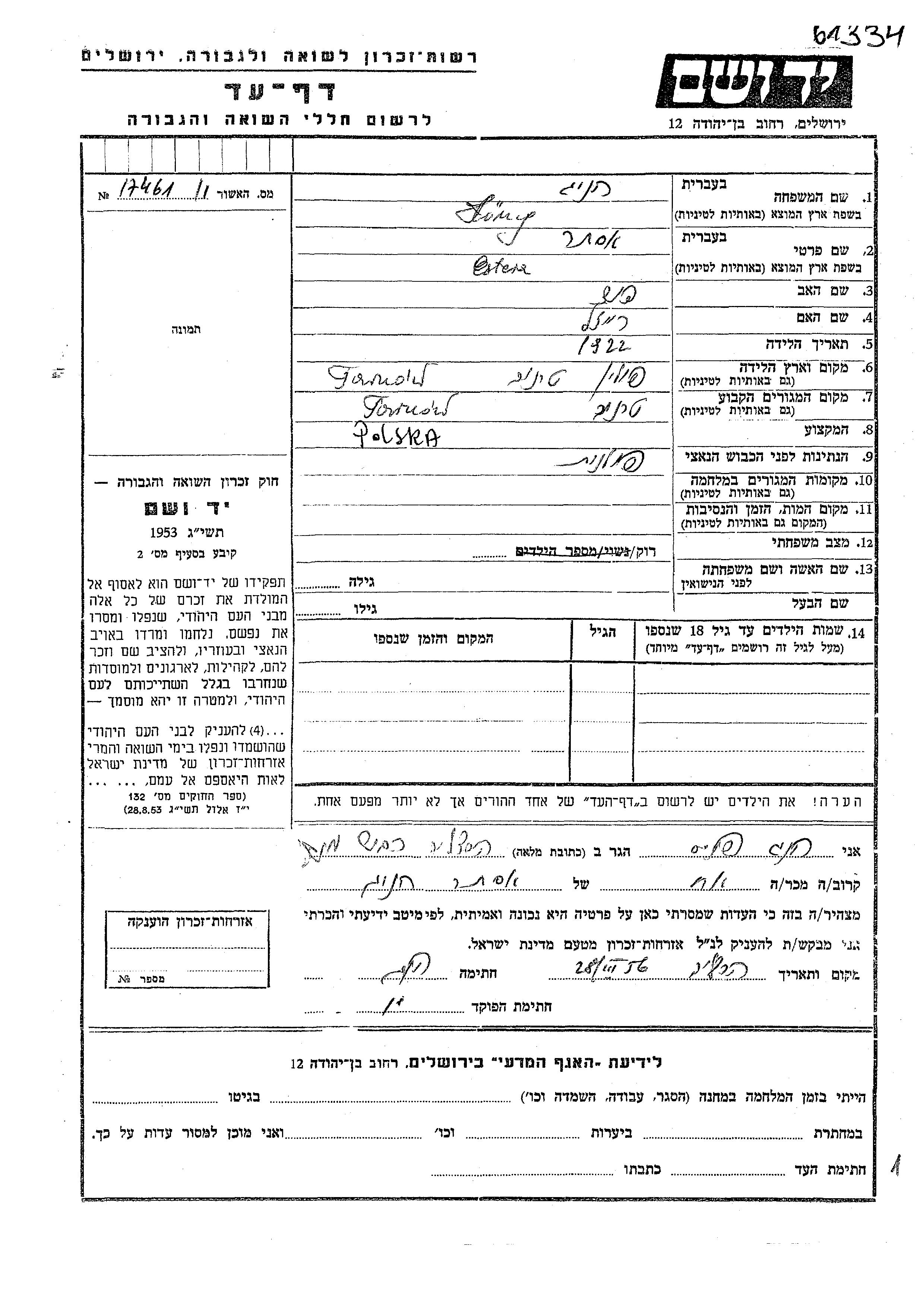 Ester wurde in der Schoah ermordet. Todesort: unbekannter Ort.