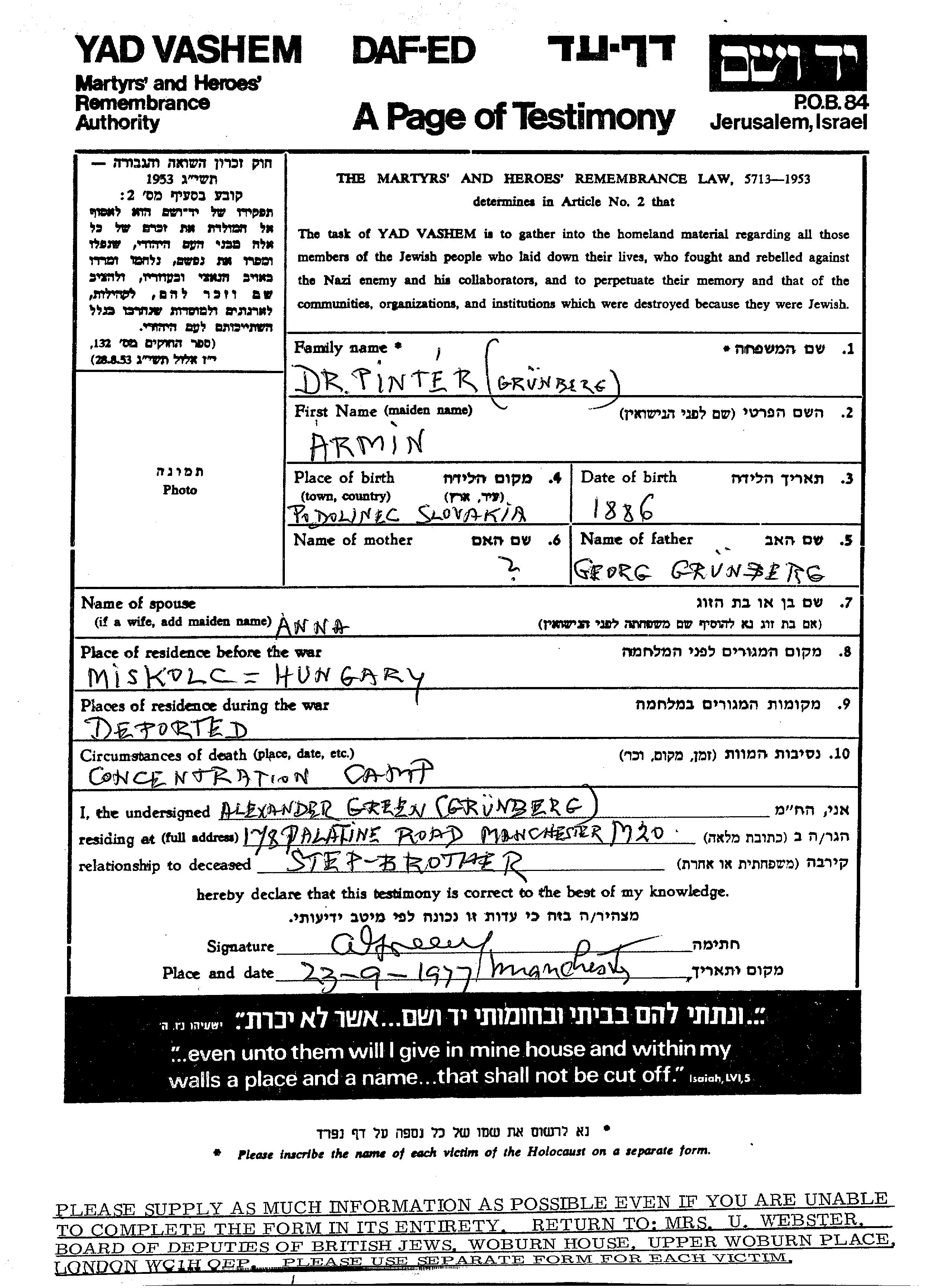 Armin Pinter Grünberg wurde im Jahr 1886 in Podolinec, Tschechoslowakei geboren. Vor dem Zweiten Weltkrieg lebte er in Miskolc, Ungarn.