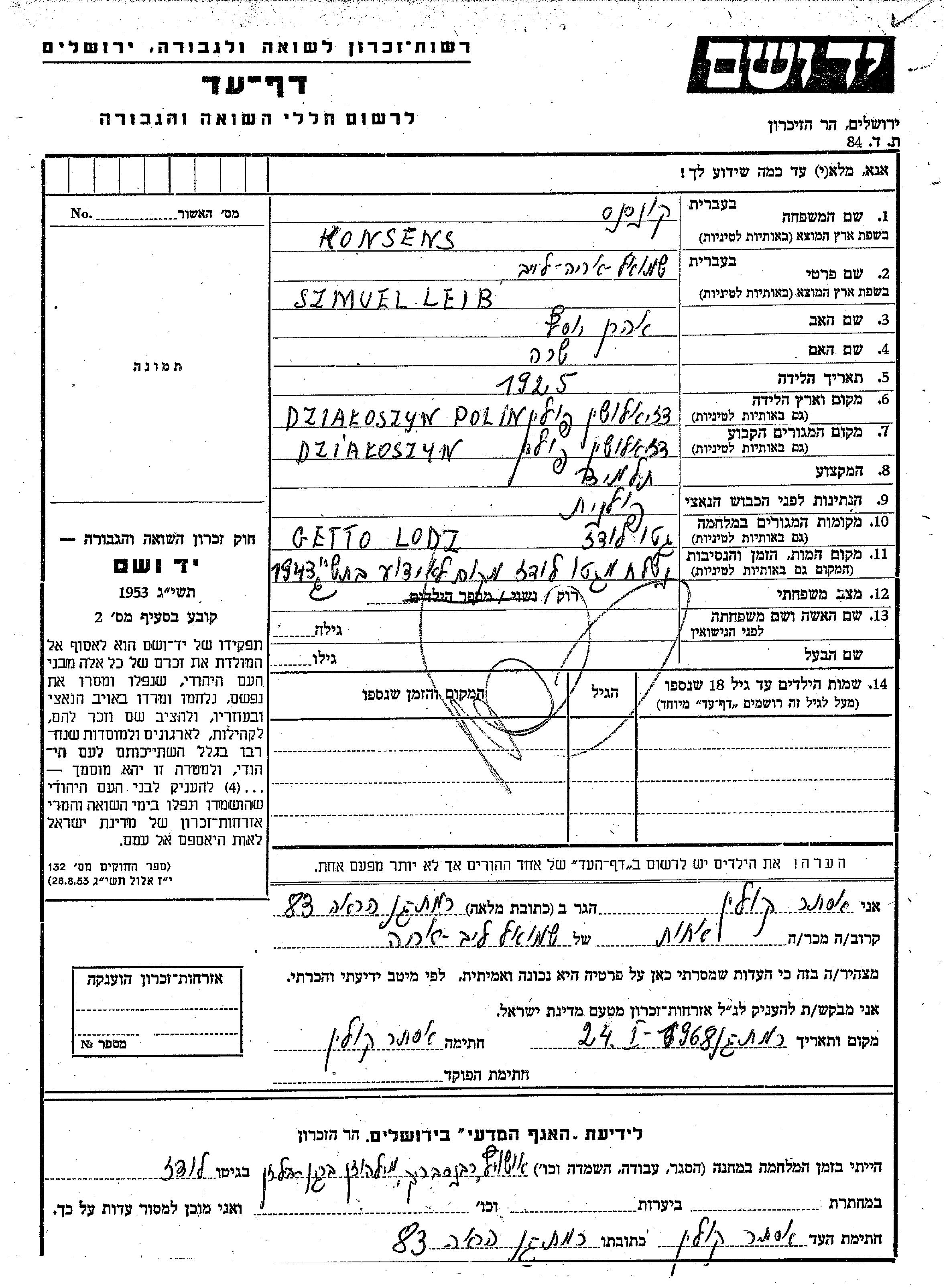 Shmuel Arie Leib Yehuda Konsens wurde im Jahr 1925 in Dzialoszyn, Polen geboren. Er war Schüler/-in. Vor dem Zweiten Weltkrieg lebte er in Dzialoszyn, Polen.