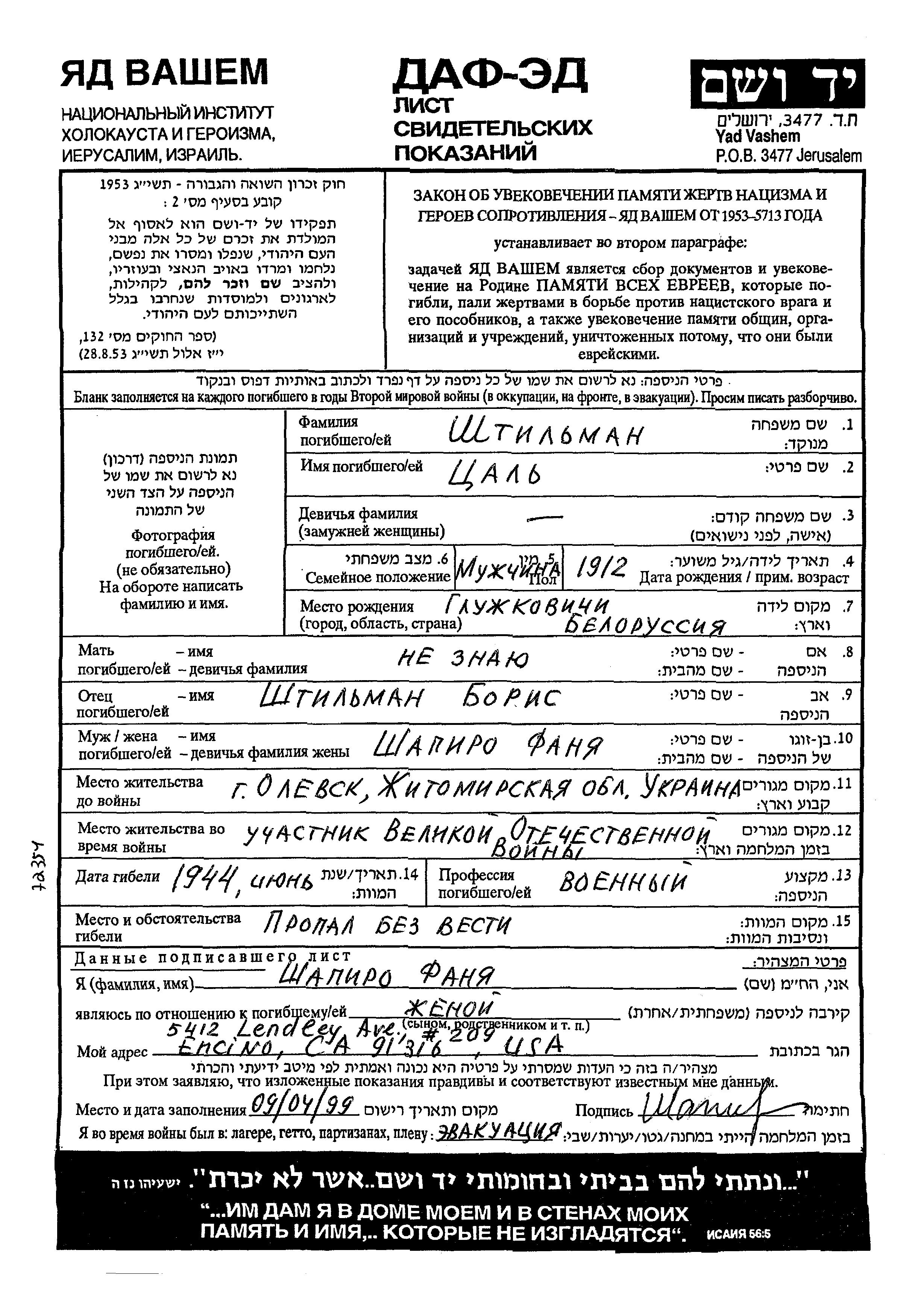 Shtilman Betzalel 1912 Olevsk, Ukraine (UdSSR) Gedenkblatt