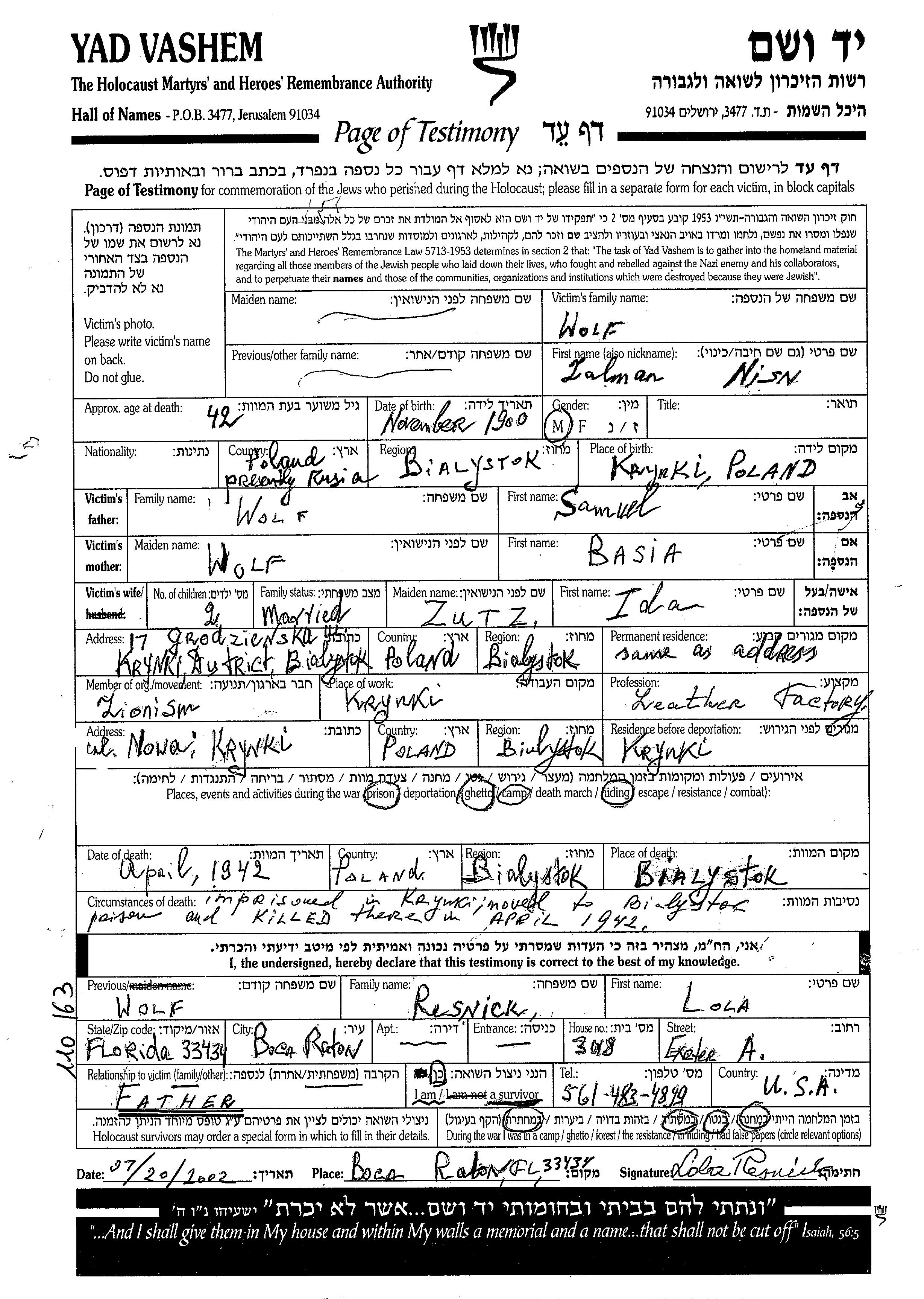 Nisn Zalman Wolf wurde im Jahr 1900 geboren. Er war Gerber. Vor dem Zweiten Weltkrieg lebte er in Krynki, Polen.
