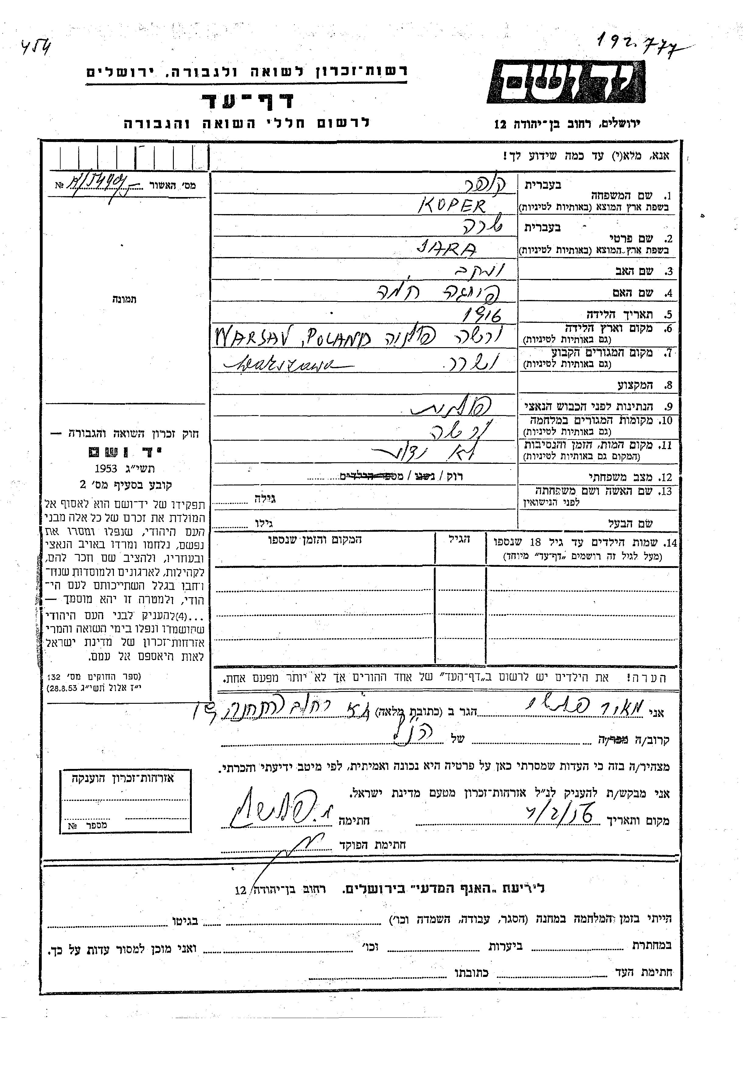 Sara Kuper wurde im Jahr 1916 in Warszawa, Polen geboren. Vor dem Zweiten Weltkrieg lebte sie in Warszawa, Polen.