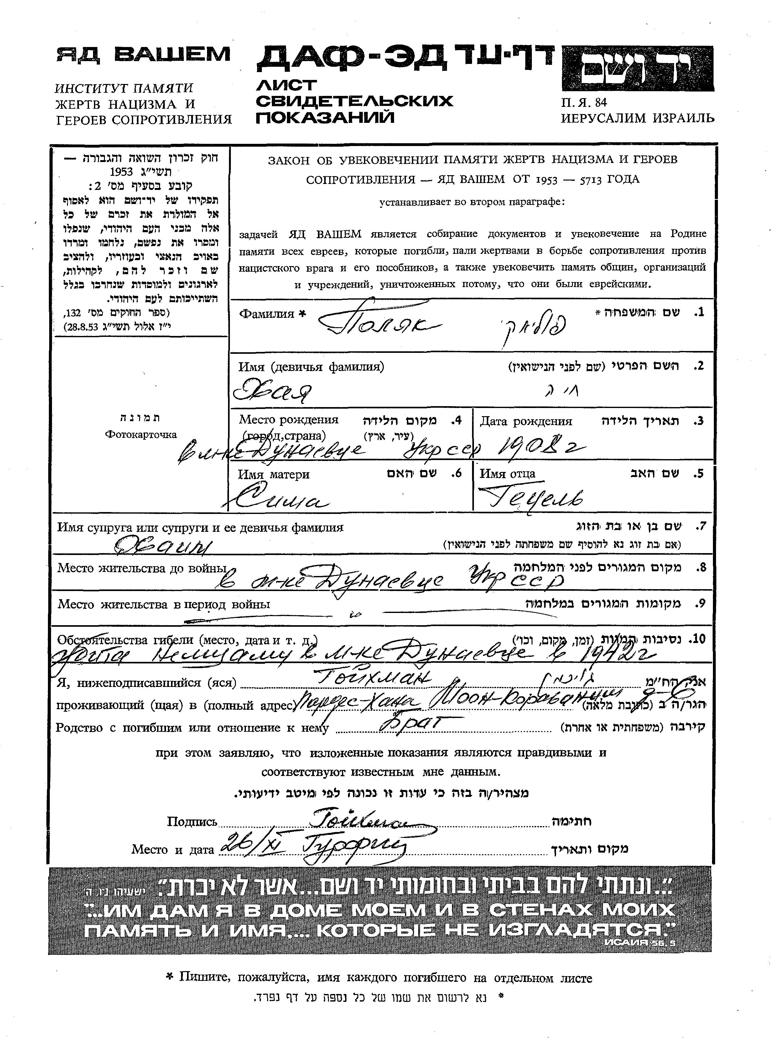 Polyak | Khaia | 1908 | Dunayevtsy, Ukraine (UdSSR) | Gedenkblatt |