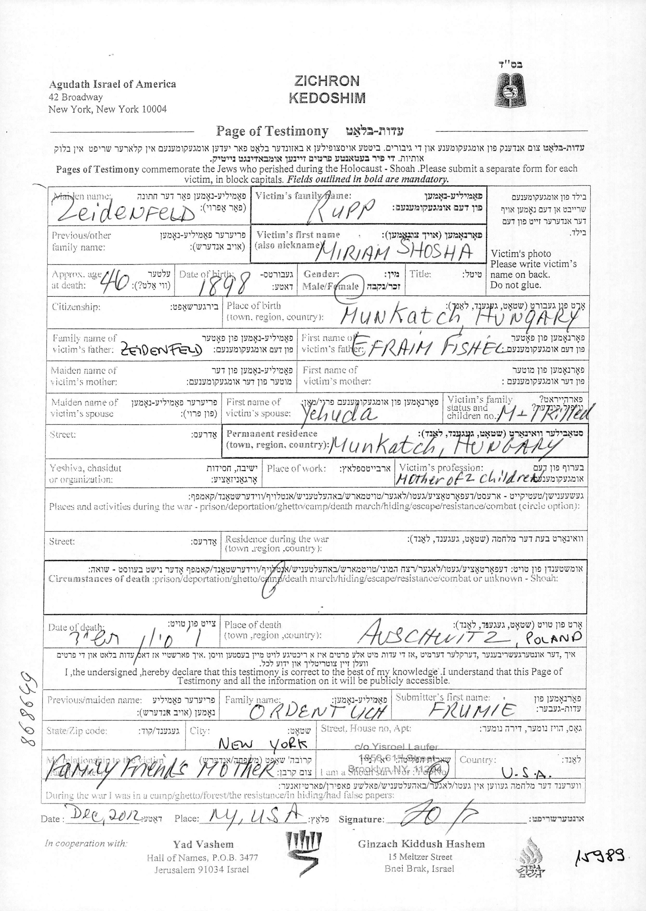 Rupp Miriam Shosha 1898 Munkacs, Tschechoslowakei Gedenkblatt