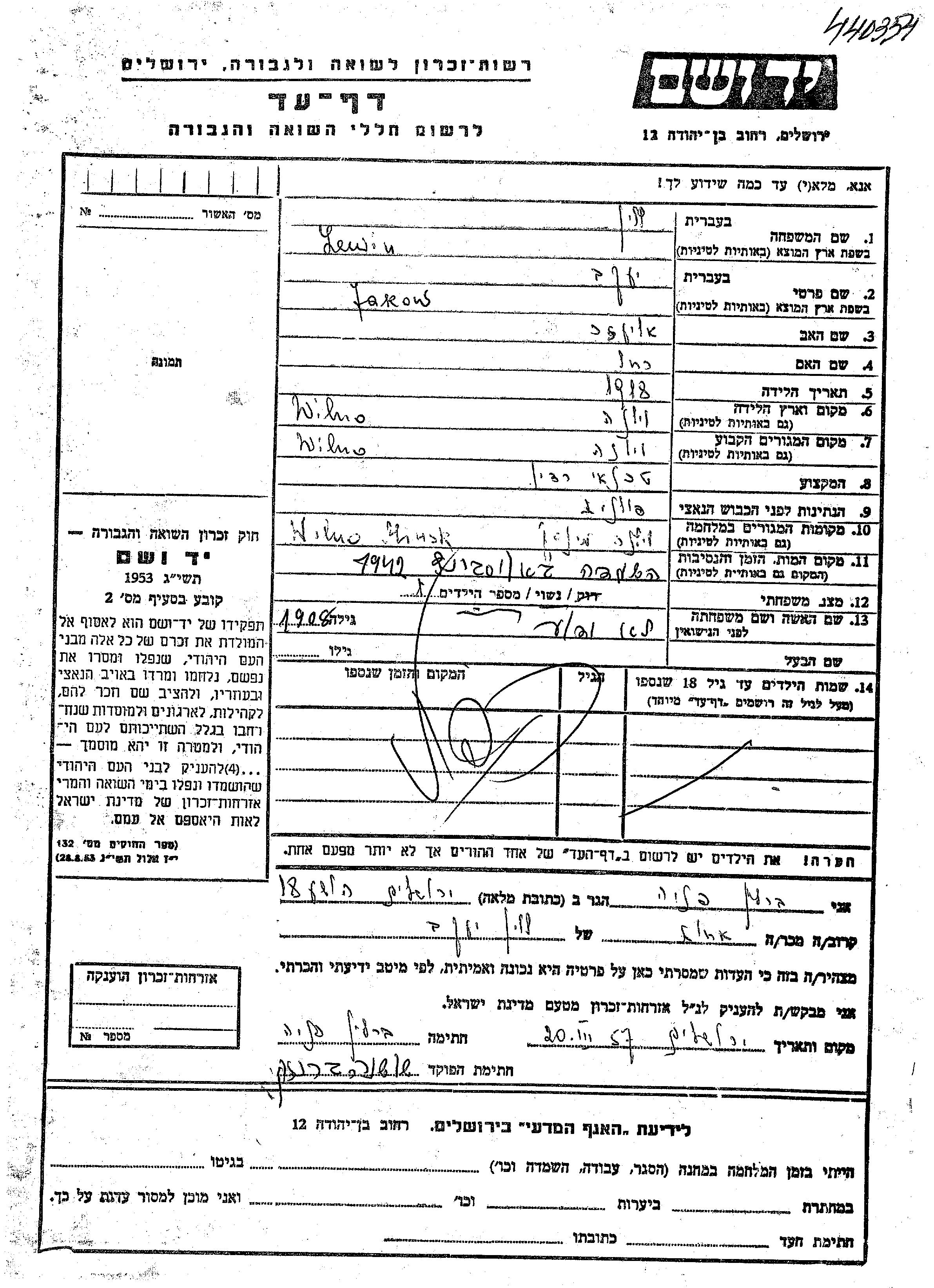 Yaakov Lewin wurde im Jahr 1918 in Wilno, Polen geboren. Er war Radiotechniker. Vor dem Zweiten Weltkrieg lebte er in Wilno, Polen.