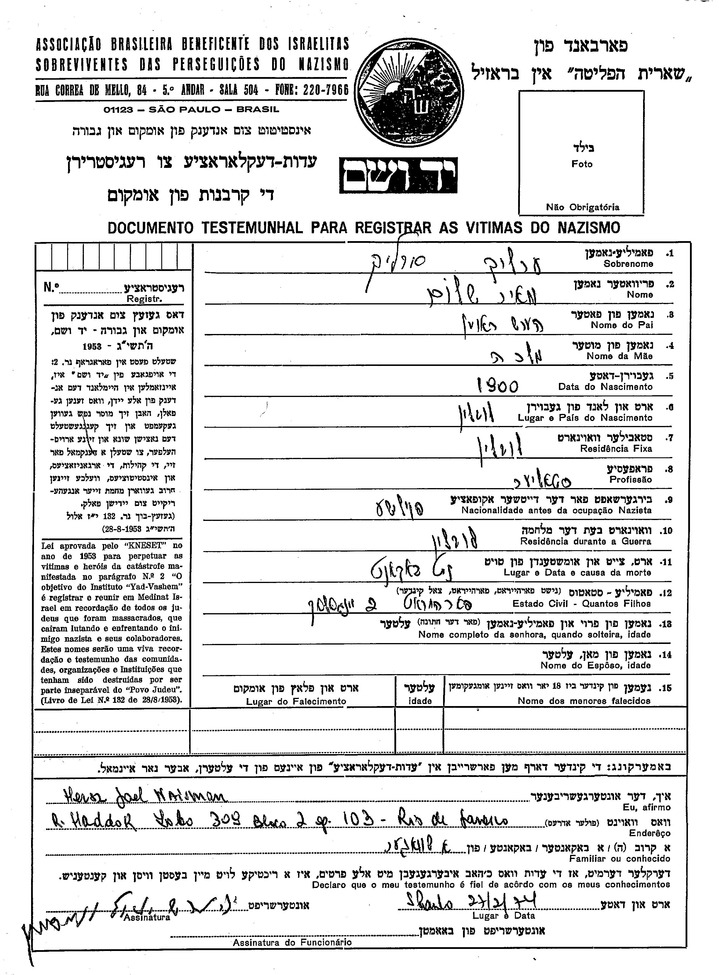 Meir Shalom Erlich wurde im Jahr 1900 in Lublin, Polen geboren. Vor dem Zweiten Weltkrieg lebte er in Lublin, Polen.