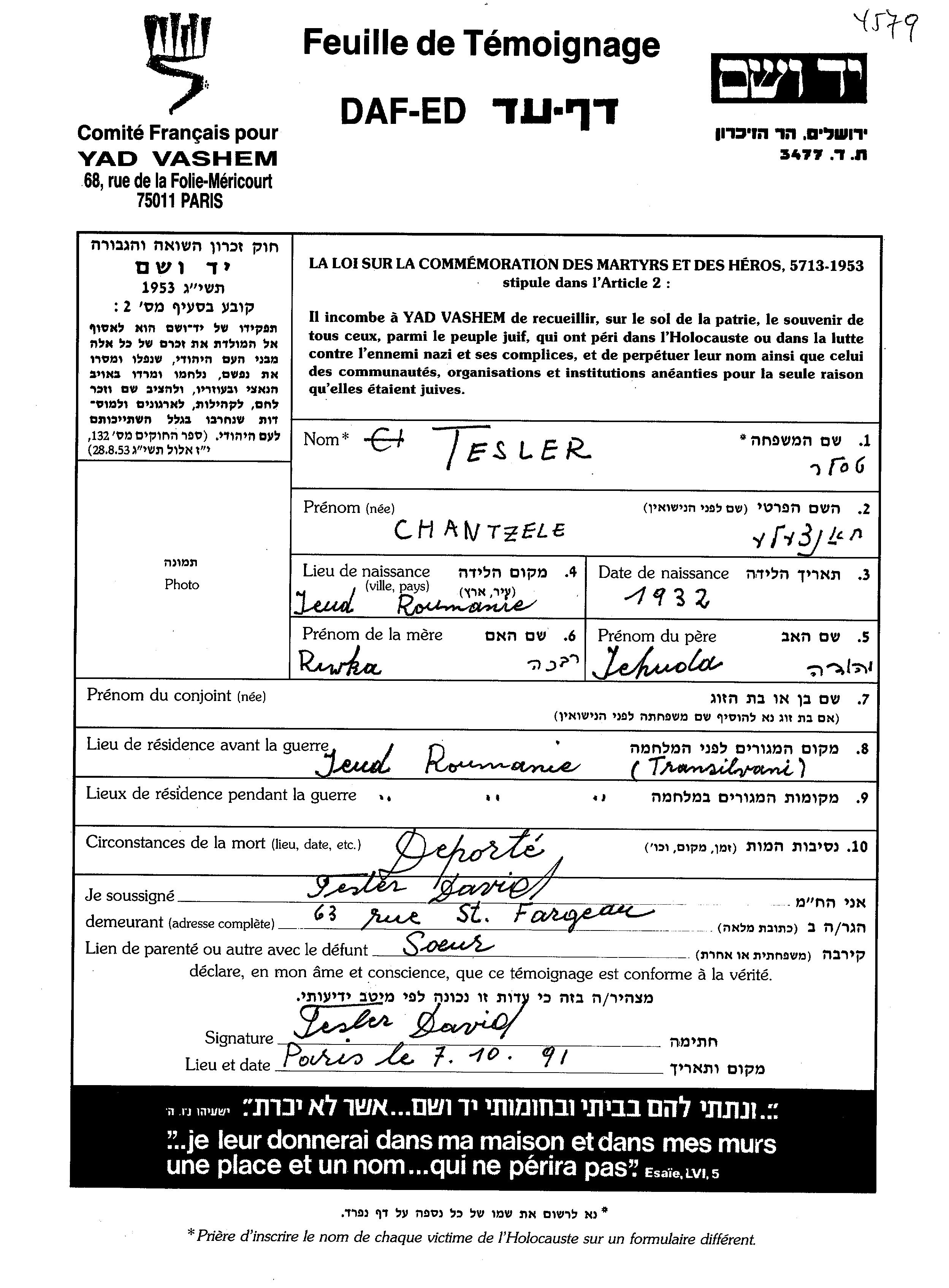 Khana Tesler wurde im Jahr 1932 in Ieud, Rumänien geboren. Vor dem Zweiten Weltkrieg lebte sie in Ieud, Rumänien.
