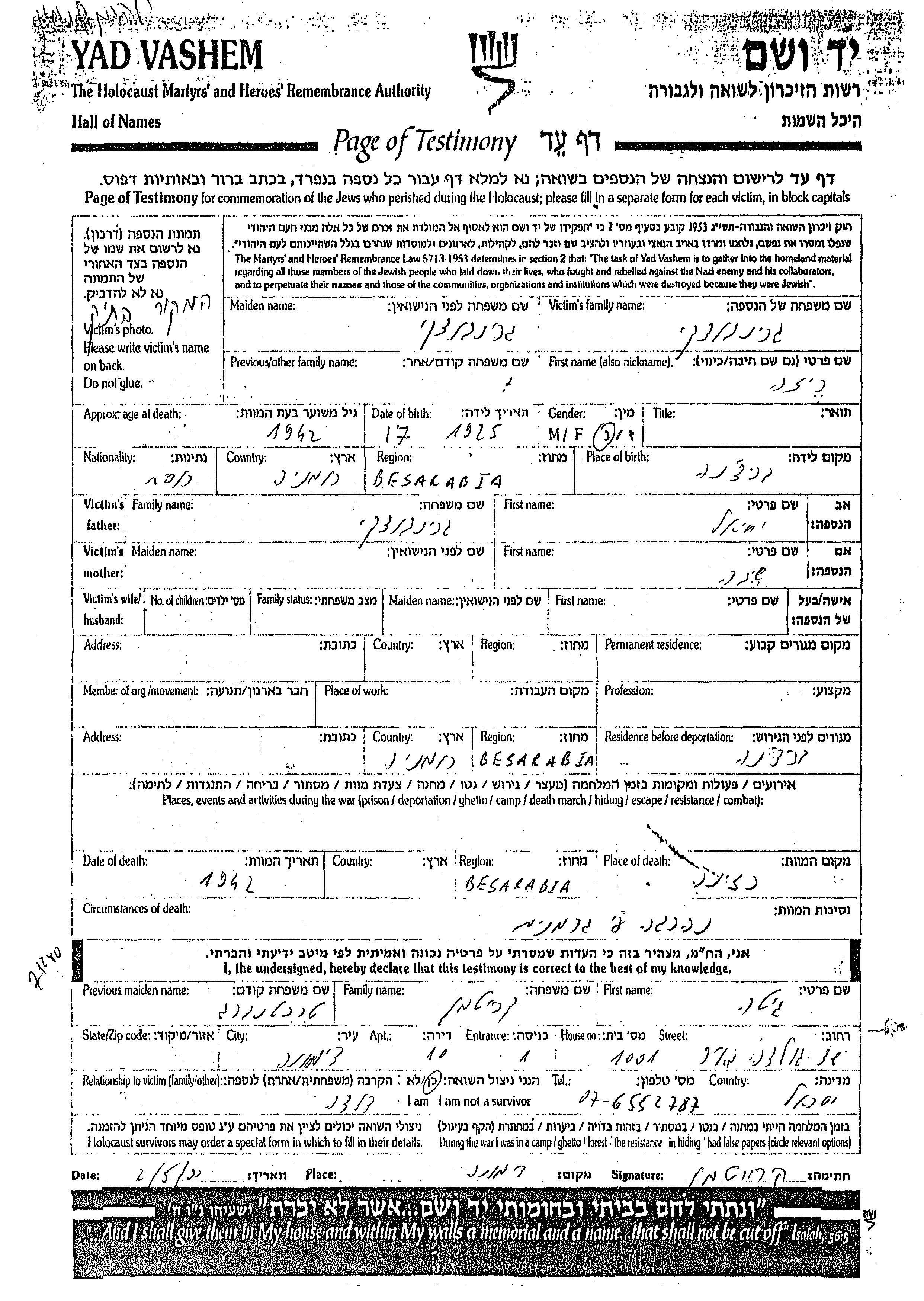 Riza wurde in der Schoah ermordet. Todesort: Rezina, Rumänien im Jahr 1942.