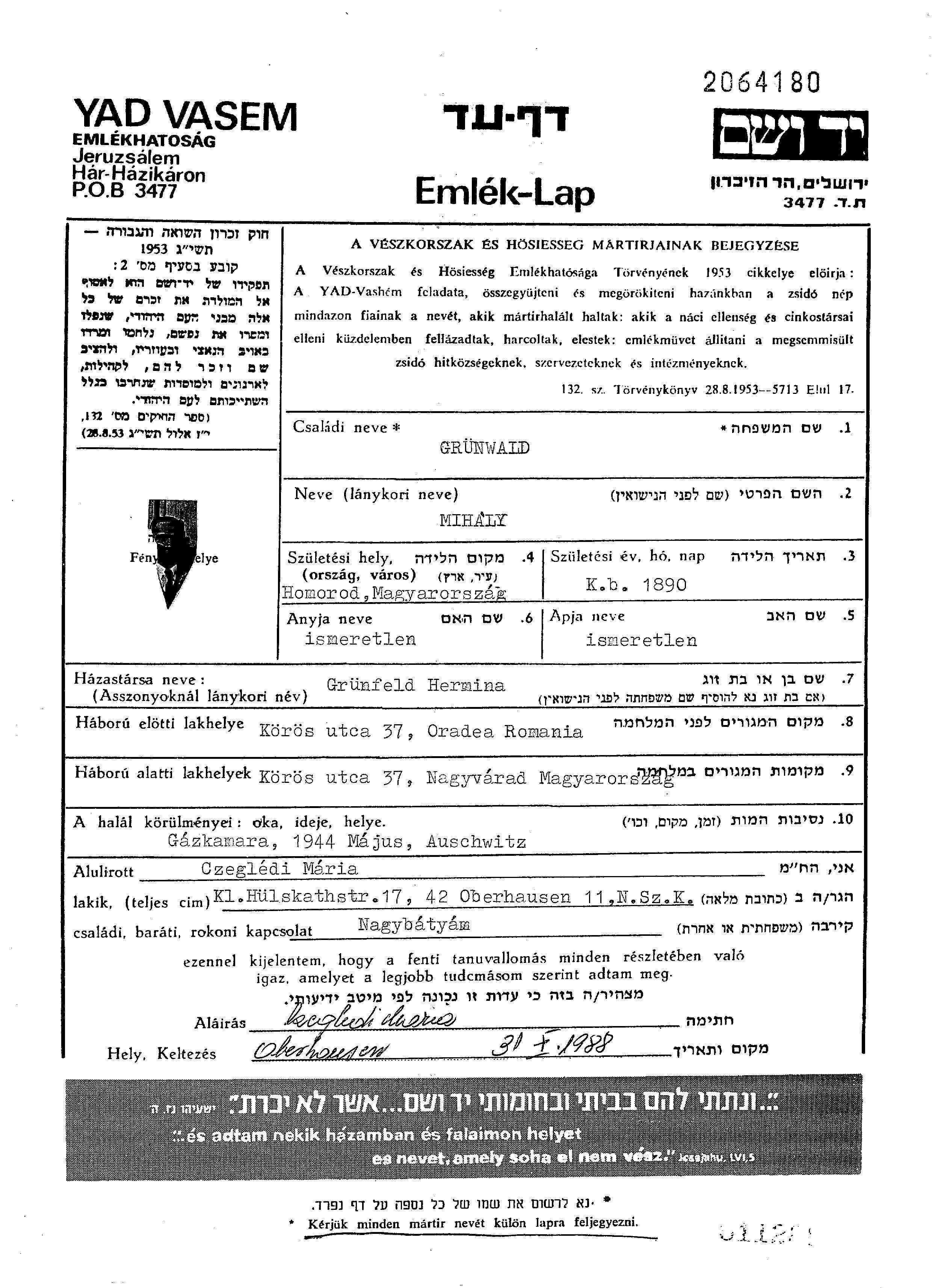 Grunwald | Mihaly | 1890 | Nagyvarad, Rumänien | Gedenkblatt |