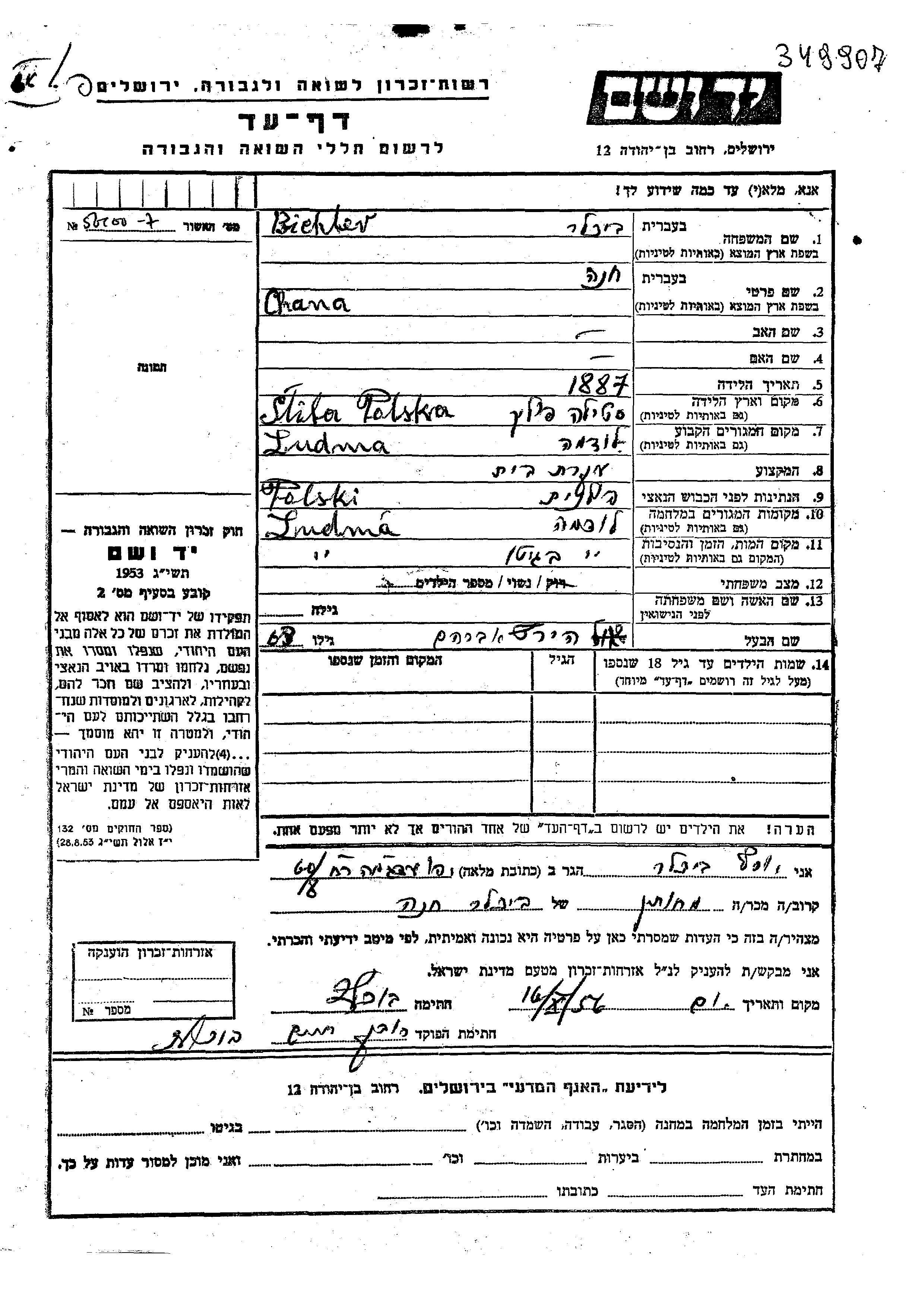 Chana Bichler, geb. Hirsh wurde im Jahr 1887 in Stila, Polen geboren. Sie war Hausfrau und mit Avraham Hirsh Verheiratet. Vor dem Zweiten Weltkrieg lebte sie in Ludma, Polen. Während des Krieges war sie in Ludma, Polen.