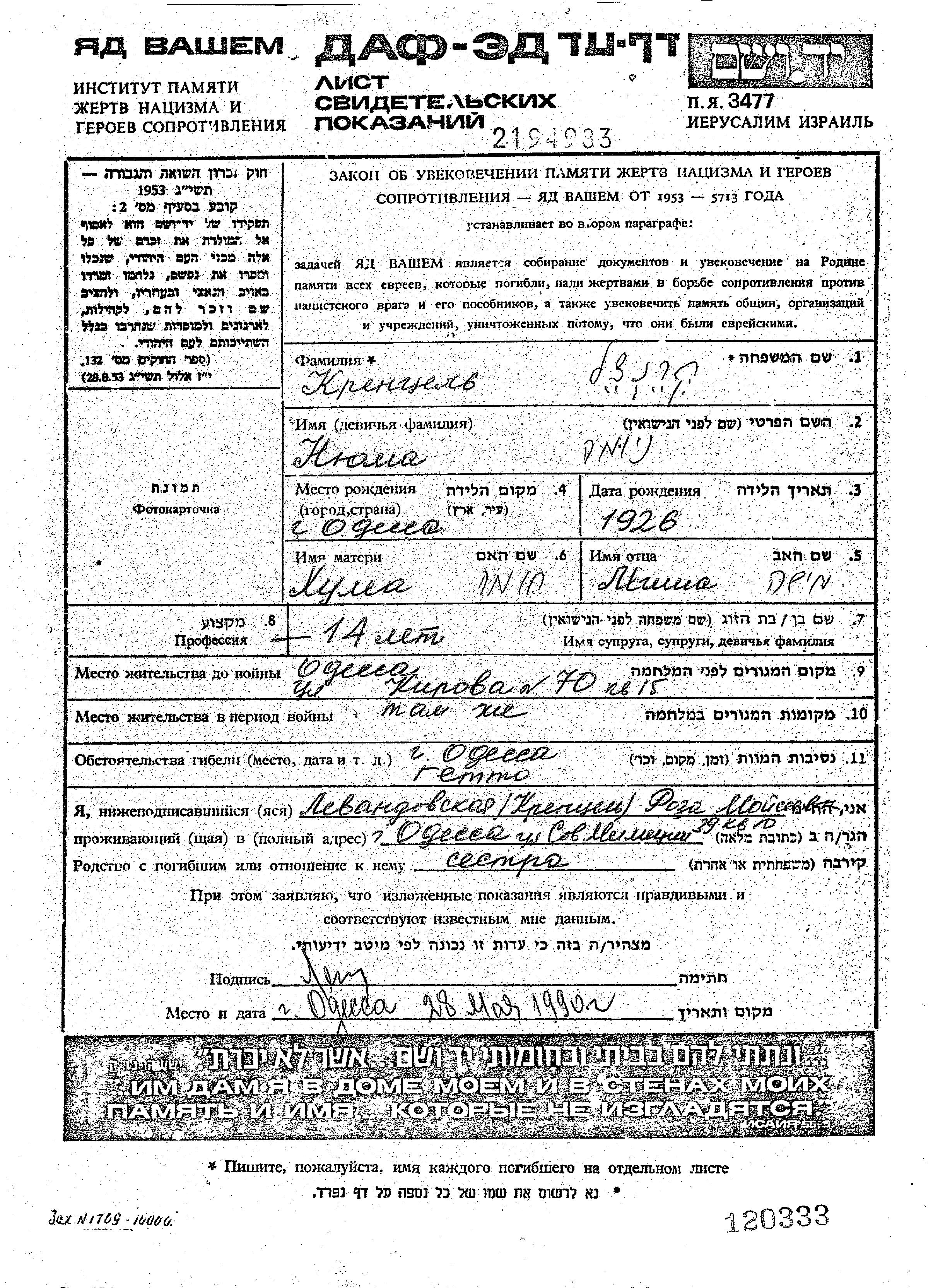 Krentzel | Nyuma | 1926 | Odessa, Ukraine (UdSSR) | Gedenkblatt |