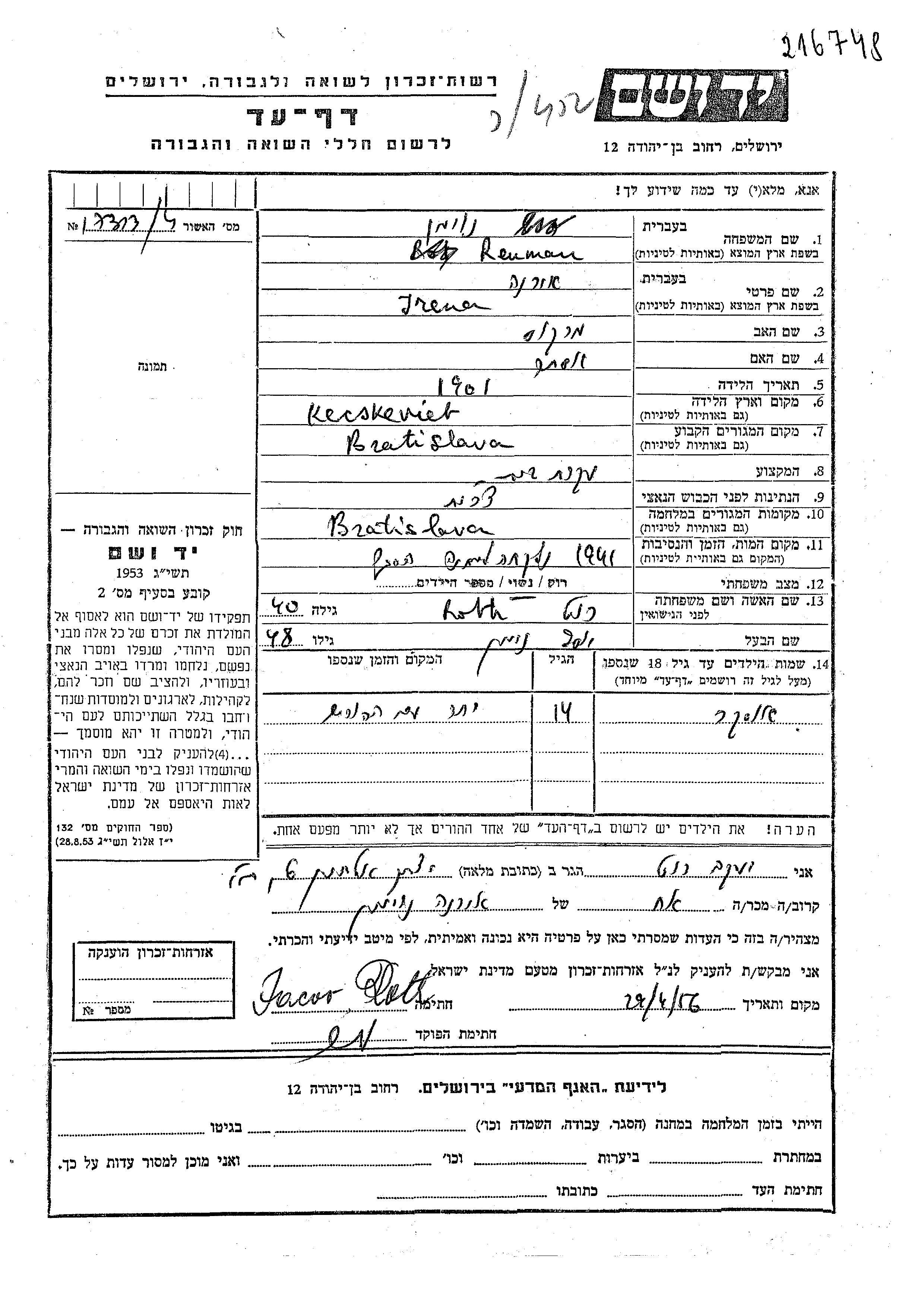 Irena Neuman, geb. Roth Ruth wurde im Jahr 1901 in Kecskemet, Ungarn geboren. Sie war Hausfrau. Vor dem Zweiten Weltkrieg lebte sie in Bratislava, Tschechoslowakei.