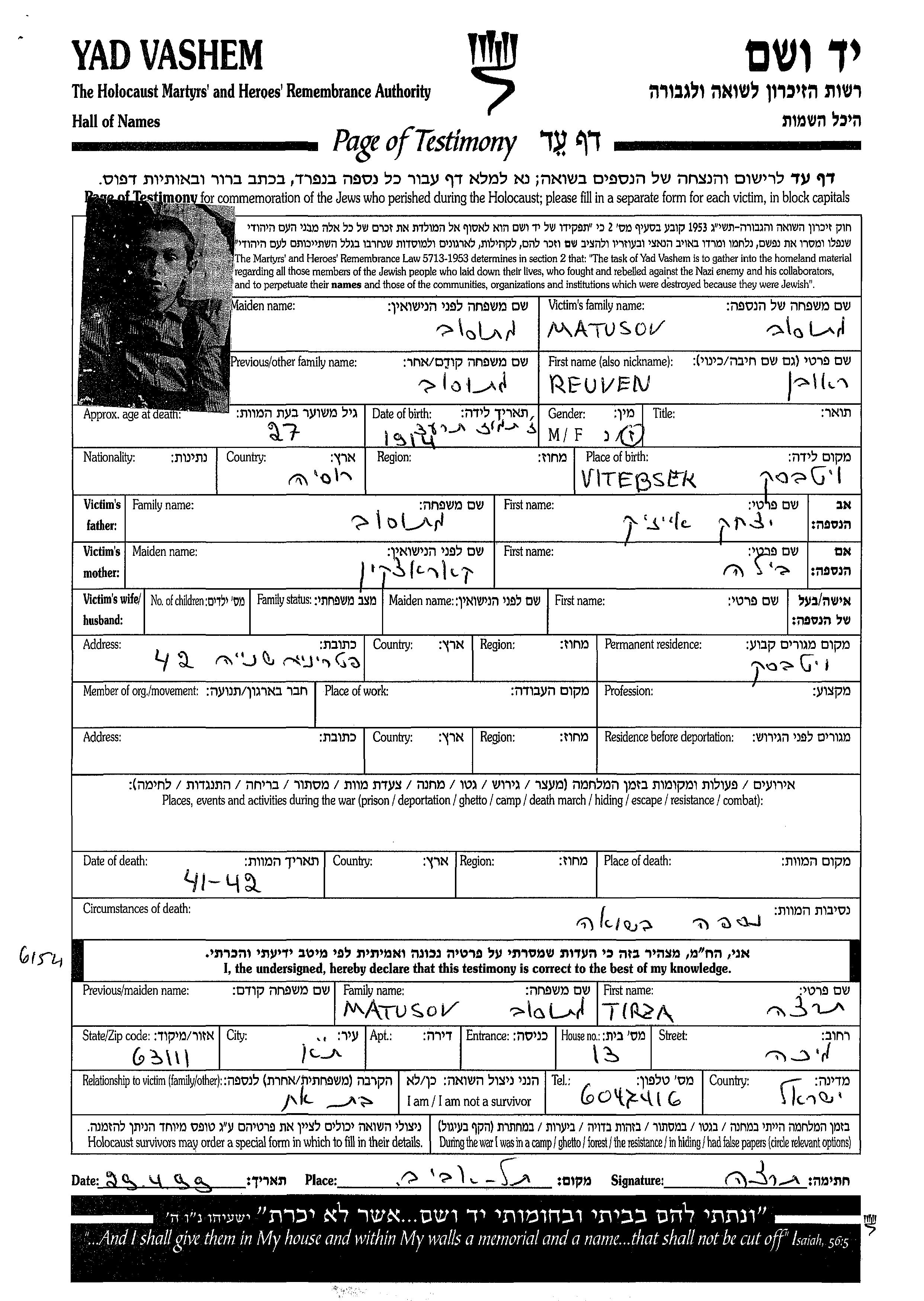 Reuven Matusov wurde im Jahr 1914 geboren. Er war Fabrikarbeiter / fabrikarbeiterin. Vor dem Zweiten Weltkrieg lebte er in Vitebsk, Weißrussland (UdSSR).
