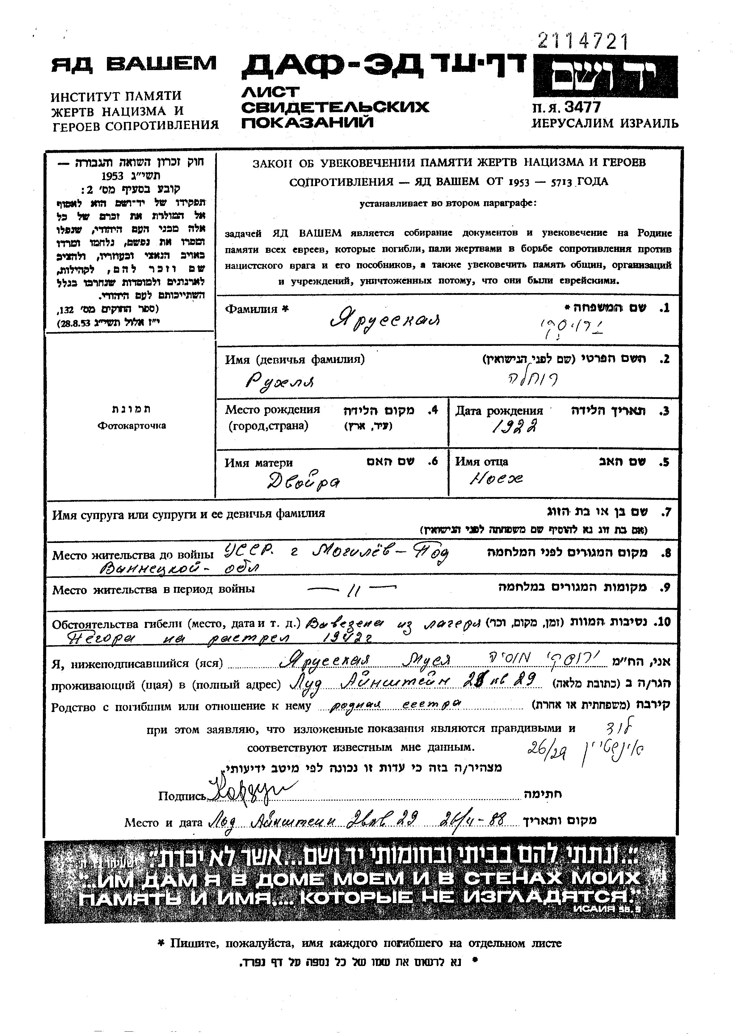Yaruskaya Rakhel 1922 Mogilev Podolski, Ukraine (UdSSR) Gedenkblatt