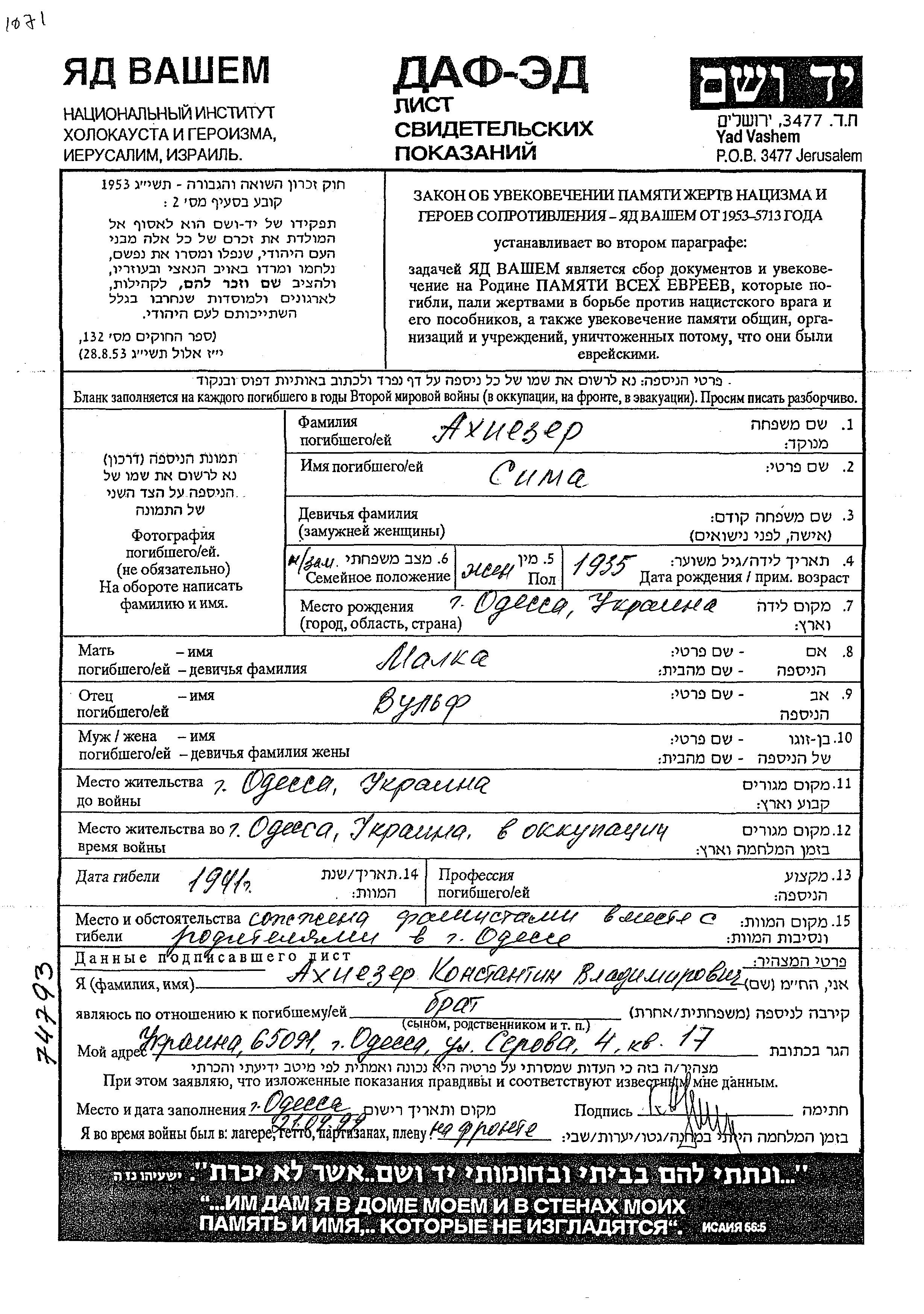 Akhizer | Sima | 1935 | Odessa, Ukraine (UdSSR) | Verfolgtenliste |
