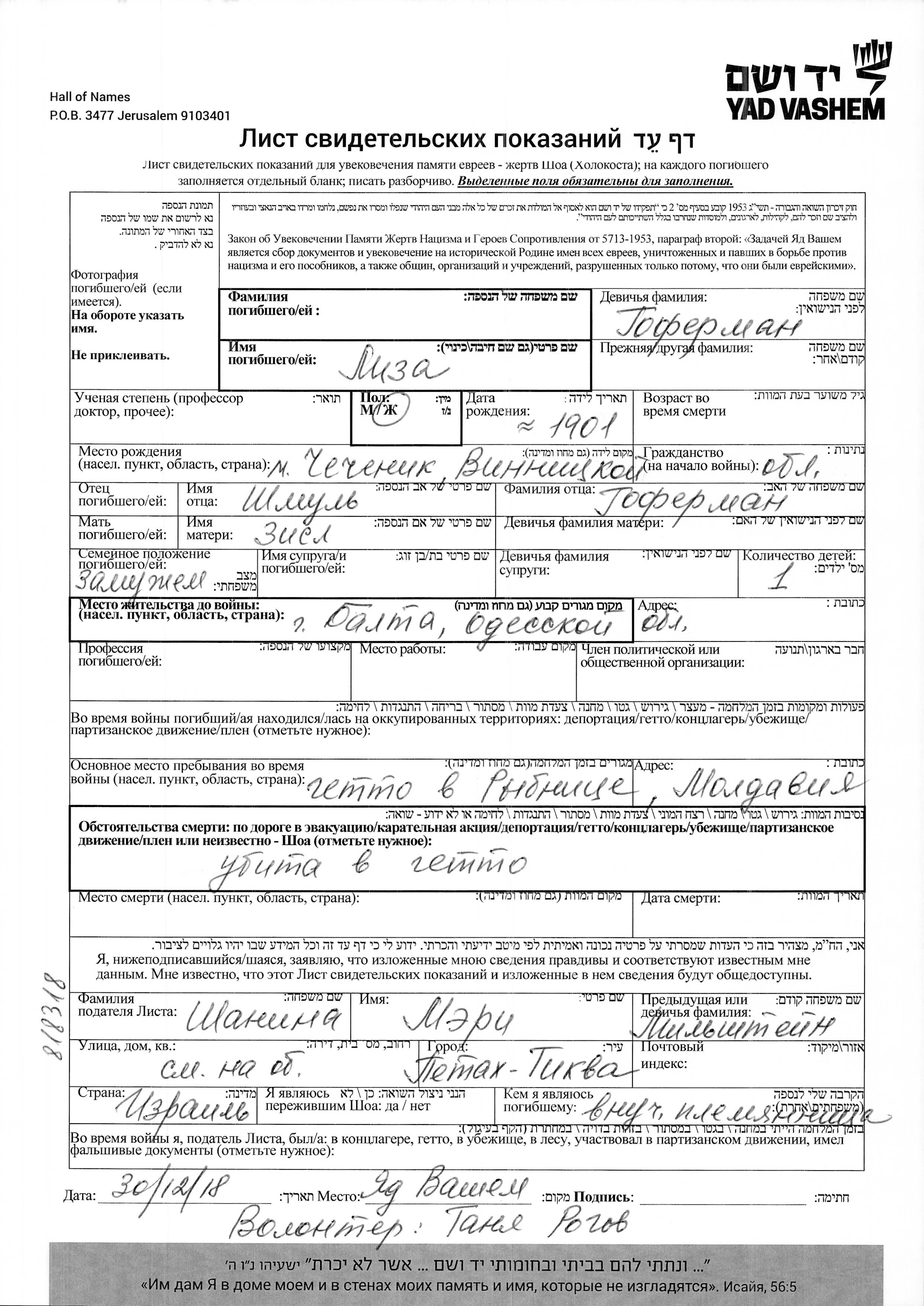 Liza Name unbekannt, geb. Goferman wurde im Jahr 1901 in Chechelnik, Ukraine (UdSSR) geboren. Sie war die Tochter von Shmul und Zisl. Sie war Verheiratet. Vor dem Zweiten Weltkrieg lebte sie in Balta, Ukraine (UdSSR). Während des Krieges war sie in Rybnitsa, Ukraine (UdSSR).