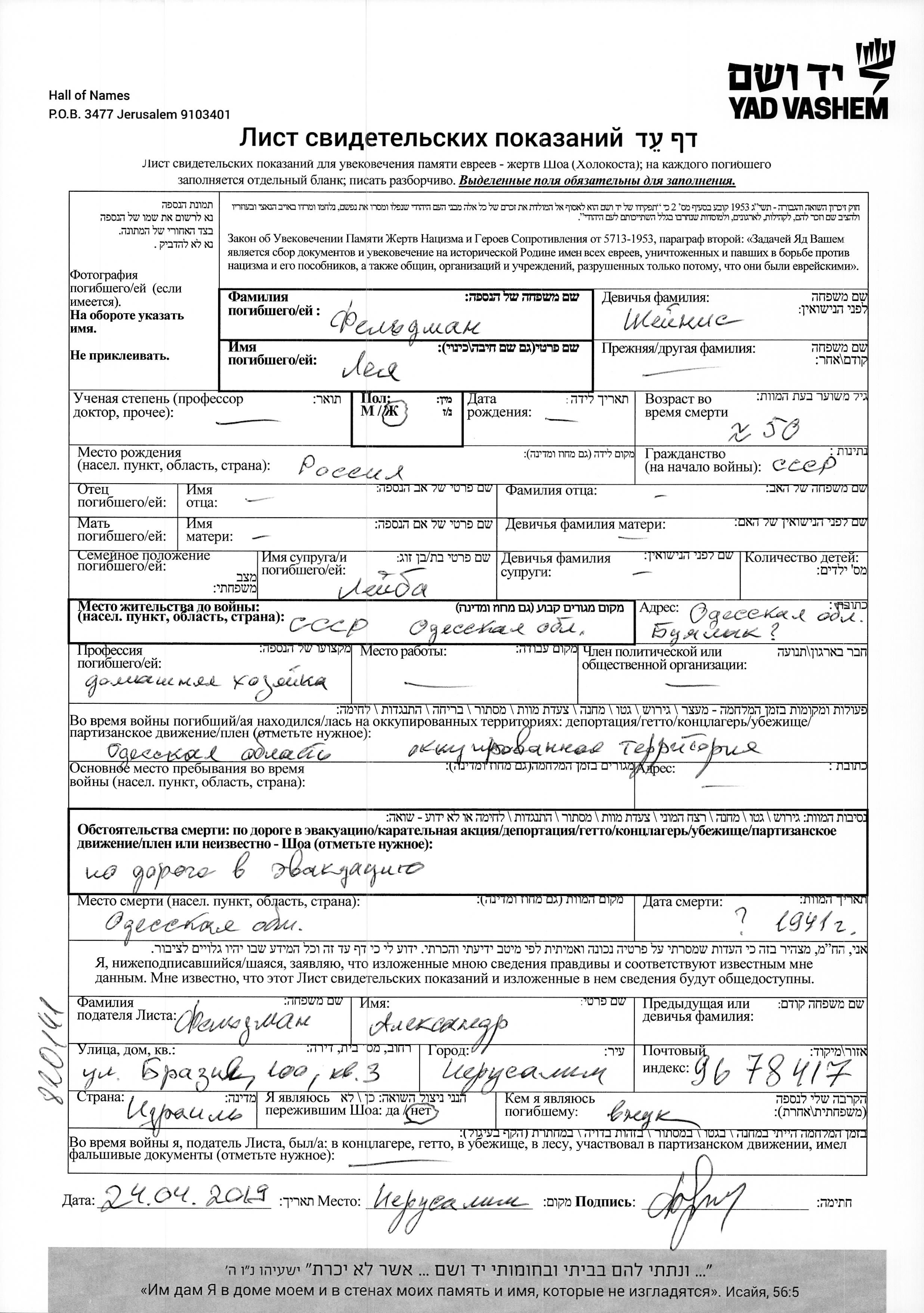 Leya Feldman, geb. Sheynis wurde in Russland (UdSSR) geboren. Sie war Hausfrau und mit Leyba Verheiratet. Vor dem Zweiten Weltkrieg lebte sie in Buyalyk, Ukraine (UdSSR). Während des Krieges war sie in Odessa, Ukraine (UdSSR).