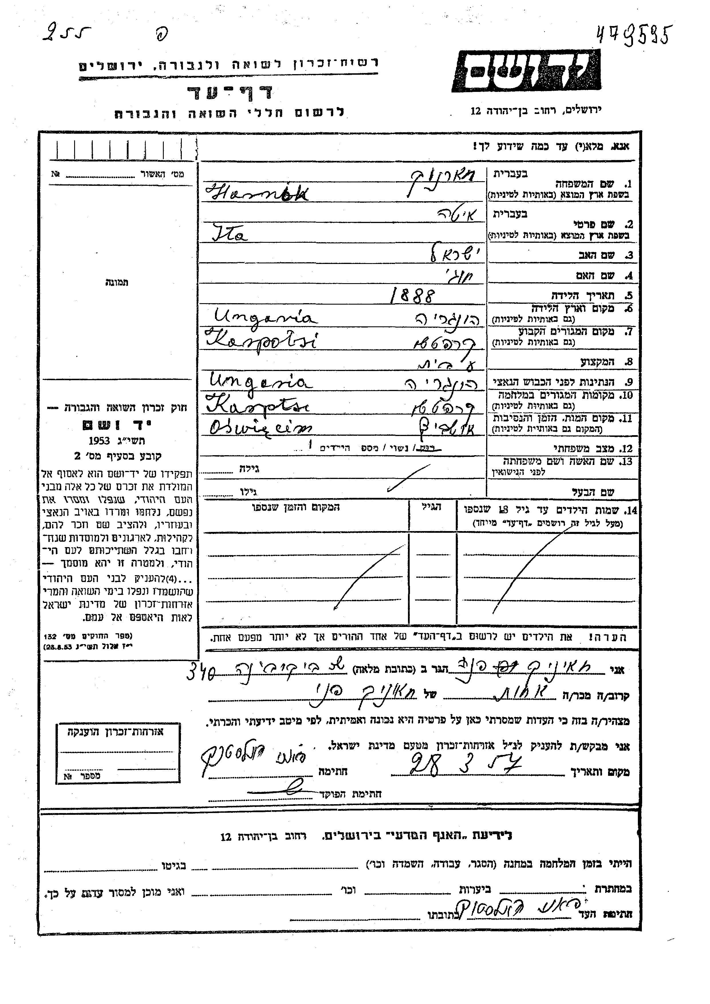 Ita wurde in der Schoah ermordet. Todesort: Auschwitz, Polen.