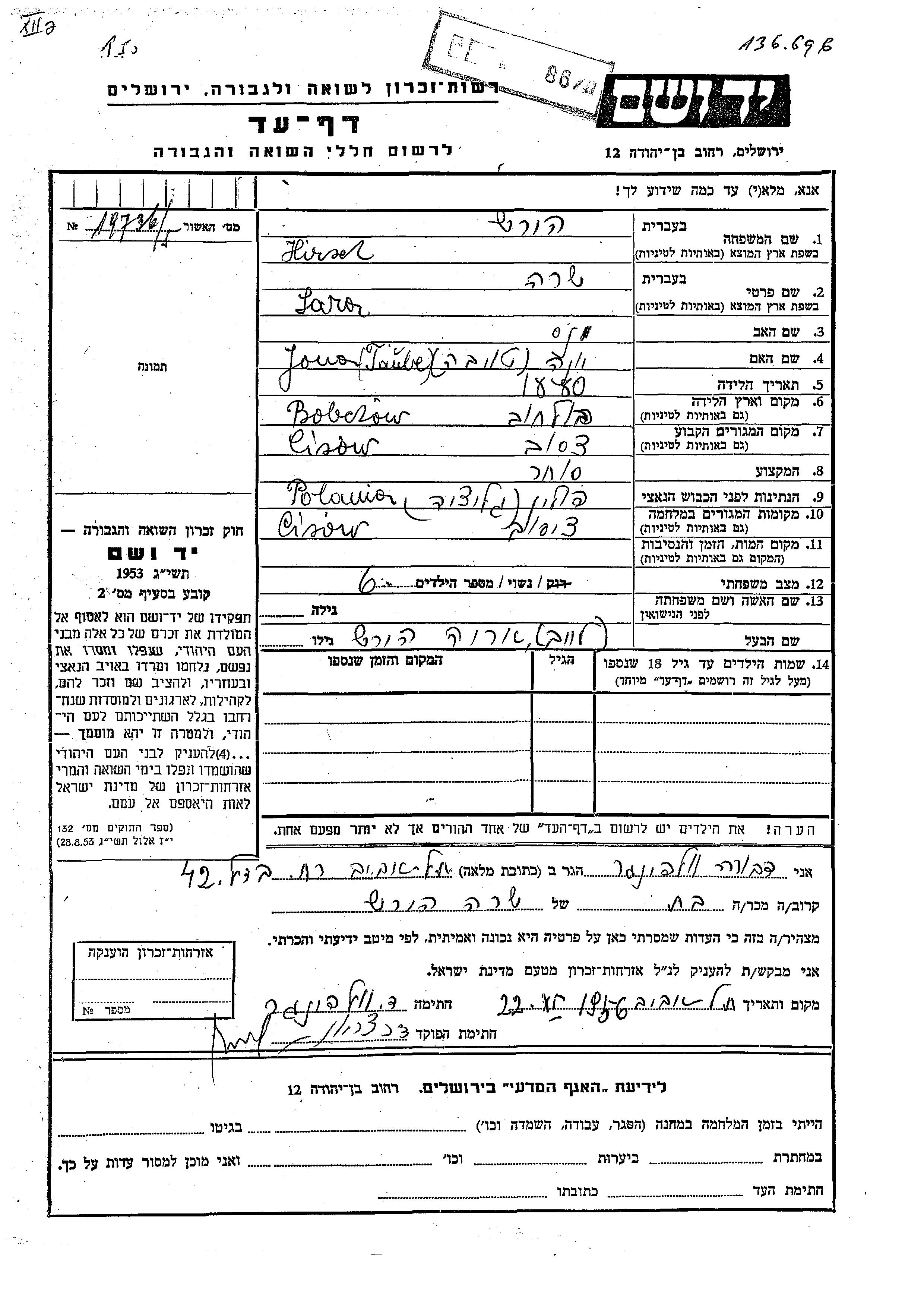 Sara Hirsh wurde im Jahr 1880 in Bolechow, Polen geboren. Sie war die Tochter von Manes und Jona Tuva. Sie war Kaufmann/-frau und mit Arie Leib Verheiratet. Vor dem Zweiten Weltkrieg lebte sie in Cisow, Polen. Während des Krieges war sie in Cisow, Polen.